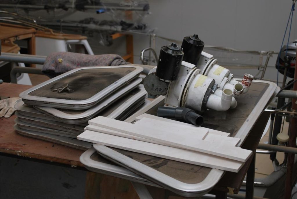 Das Bild zeigt die ausgebauten Fenster (Ersatz durch bruchsicherem Doppelglas) sowie die beiden alten Bilgenpumpen (1:1 Ersatz durch neue):