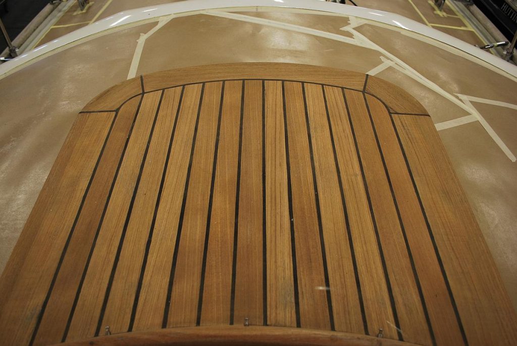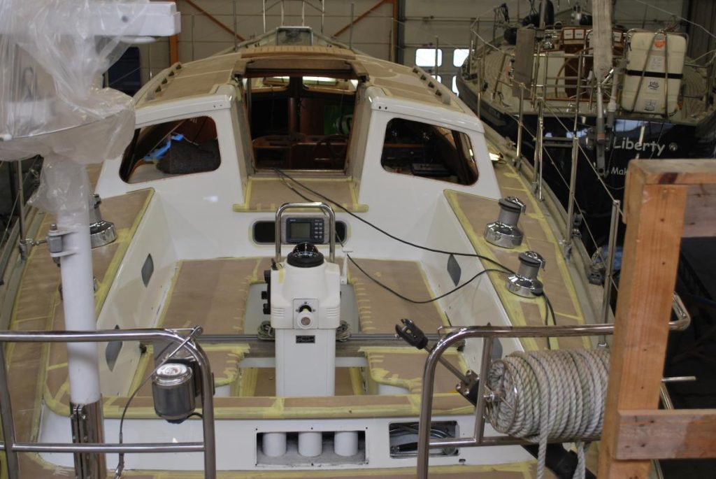 Die Überholung des Teakdecks ist fertig – so richtig sehen kann man das nur an einer Stelle, alles andere ist sauber eingepackt um die Lackierarbeiten am Aufbau durchführen zu können: