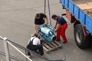 Der Motor wird auf eine Palette gestaut, um ihn dann in die Halle zu bringen