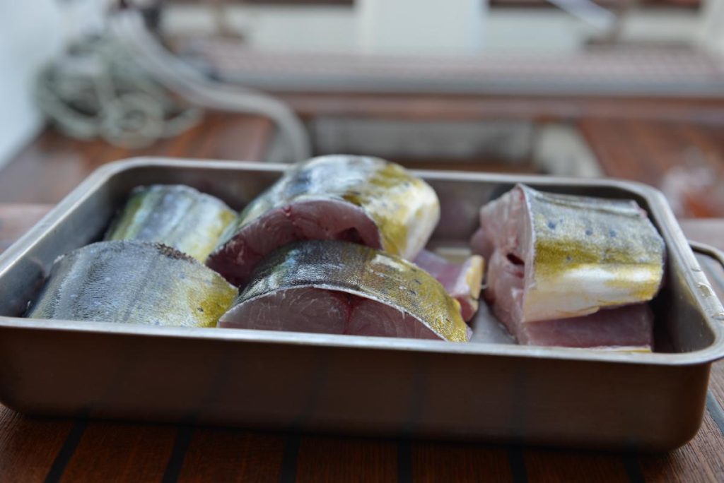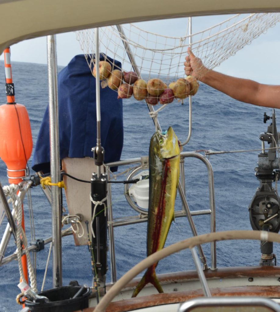 Tja, und dann liegt er da. Zappelt ab und zu noch…jedenfalls mache ich ihm schnell ein Ende in dem ich mit dem super-scharfen Samurei Messer eines gewissen Oliver G. aus K. ihm den Kopf abtrenne. Dann fix ausgenommen, in 5 Teile zerlegt und das Deck von dem ganzen Blut und Dreck gereinigt. Nach Rücksprache mit MAUNIE haben wir einen Mahi Mahi gefangen. Echt schönes Tier so mit der gelben Haut und den blauen Punkten. Das Fleisch ist weiß und fest – echt super! Heidi schätzt den Fang auf 2-3 Kilo, ich gehe mal von 4 aus!