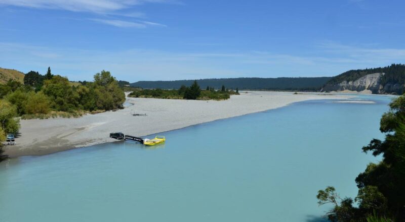 Nach einer halben Stunde kommen am Horizont die Berge in Sicht und auf einmal passieren wir den RAKAIA RIVER und fangen an, die Kamera im noch nicht ausgepackten Gepäck zu suchen. Ein paar Bilder geschossen, zum Beispiel dieses: