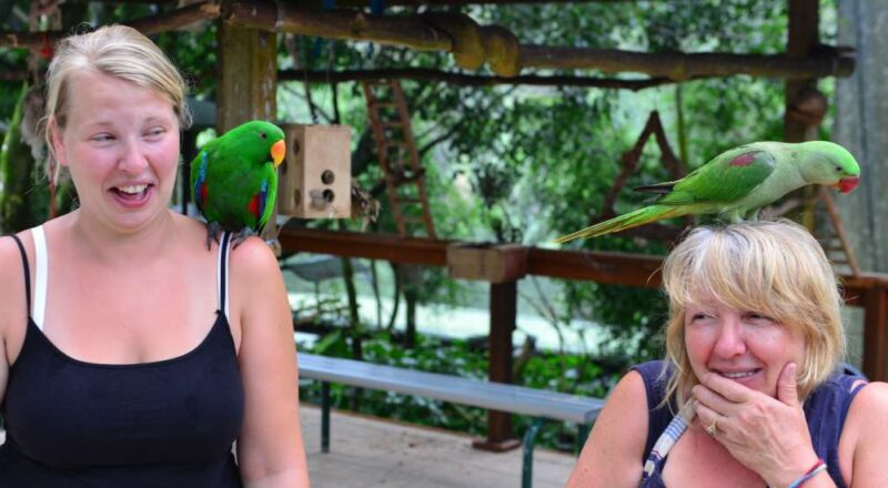 Erstes echtes Highlight des Tages ist der kleine Vogelpark in KURANDA. Dort fliegen die Vögel frei herum und die ganz mutigen Papageien landen denn gerne auch mal auf den Besuchern. Einige sind durch Hüte geschützt, andere zeigen zu viel nackte Haut (siehe Titelbild).