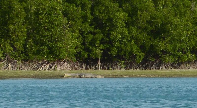 Heidi hat am Abend Hary besucht – nicht den Skipper der BOUNTY (die schippern wohl gerade irgendwo zwischen VANUATU und AUSTRALIEN herum), sondern das hier ortsansässige Krokodil. Das ist 4 Meter lang, lebt in freier Wildbahn und kommt jeden Nachmittag vor die Mangroven am Ankerplatz um sich zu sonnen. Spätestens, wenn Hary ins Wasser gleitet flüchten die im Gummiboot sitzenden Zaungäste schlagartig 😉
