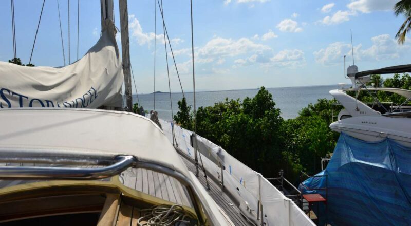 Die Werft hier in der RAFFLES MARINA SINGAPORE (die Werft ist geschäftlich getrennt und heißt MARINA YACHT SERVICE) konnte uns höher aufbocken so das wir den Schenkkiel im Lagerbock voll ausfahren können. Zwei Tage später, am Donnerstag erneuter Test. Der Kielkasten ist von unten so gut wie möglich gereinigt und sieht sauber aus. Aber: Wir hören ein „Quietschen“ beim Ausfahren und ungefähr auf der Hälfte bleibt das Teil stecken. Wenn man dann am Kiel zieht („wackeln“ und „rappeln“ geht nicht – kein Spiel) kommt er ganz raus…aber wir können ja nicht immer ins Wasser springen und tauchen, um das Teil heraus zu bekommen 😉
