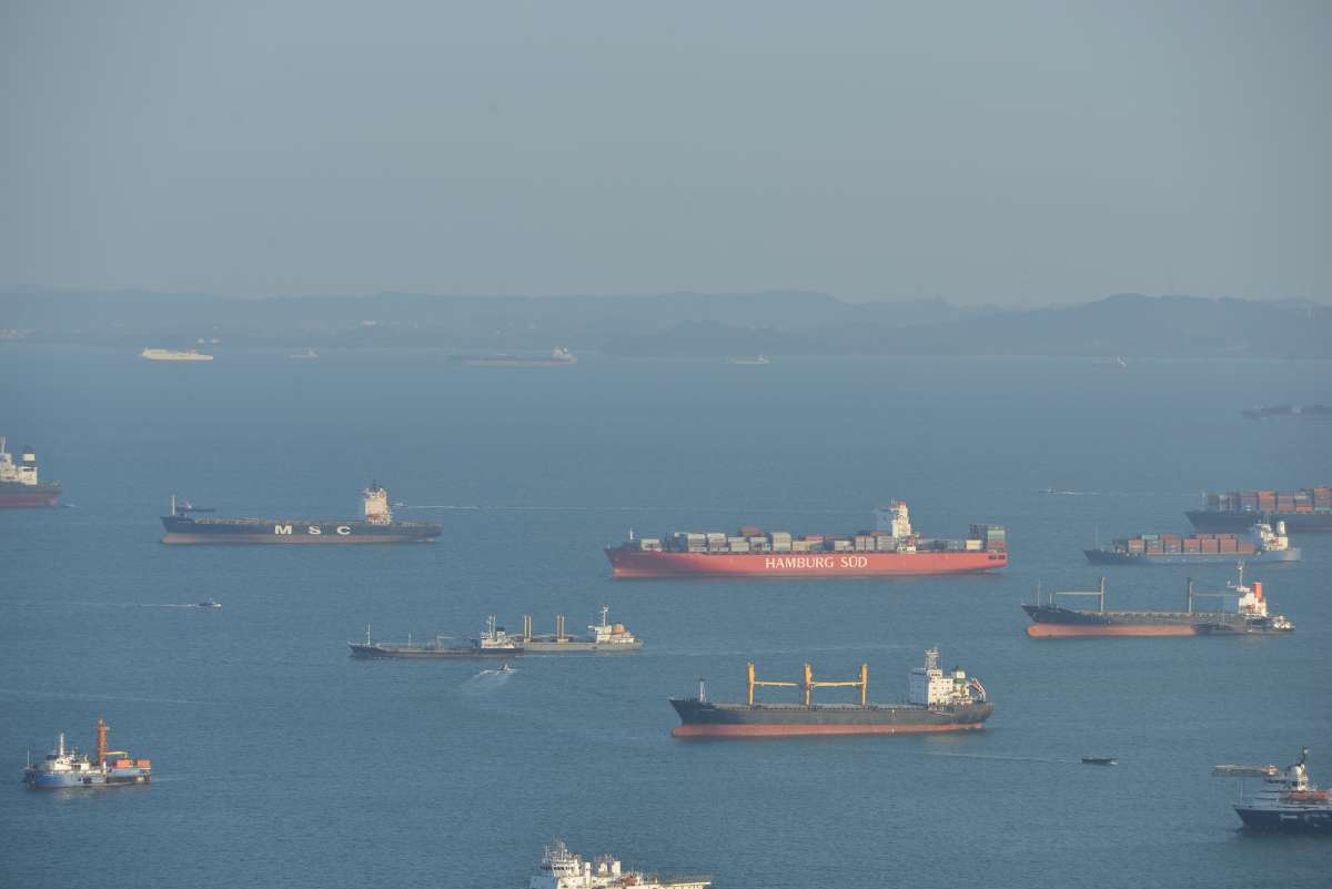 Der Rundumblick ist wirkich wahnsinnig – wir haben Glück mit dem Wetter! Auf Reede sehen wir einen großen HAMBURG SÜD Dampfer (die CAP ARNAUTI) und natürlich hunderte andere Dampfer. Heidi erblickt am Boden gelbe Ameisen – Menschen beim Sport.
