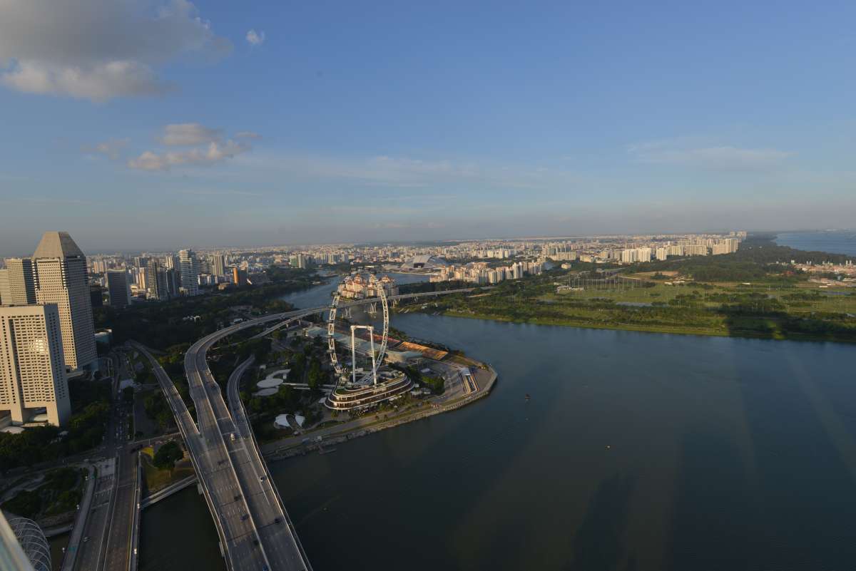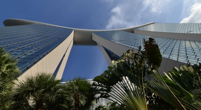 Das THE MARINA BAY SANDS überragt alles und die Dachkonstruktion, die über den drei Türmen liegt, mutet tatsächlich wie ein Schiff an – obglich sie gebogen ist.