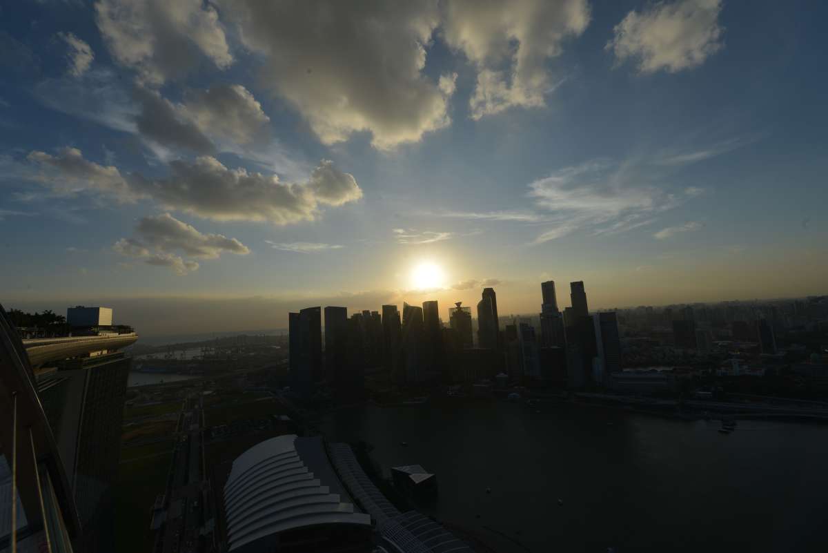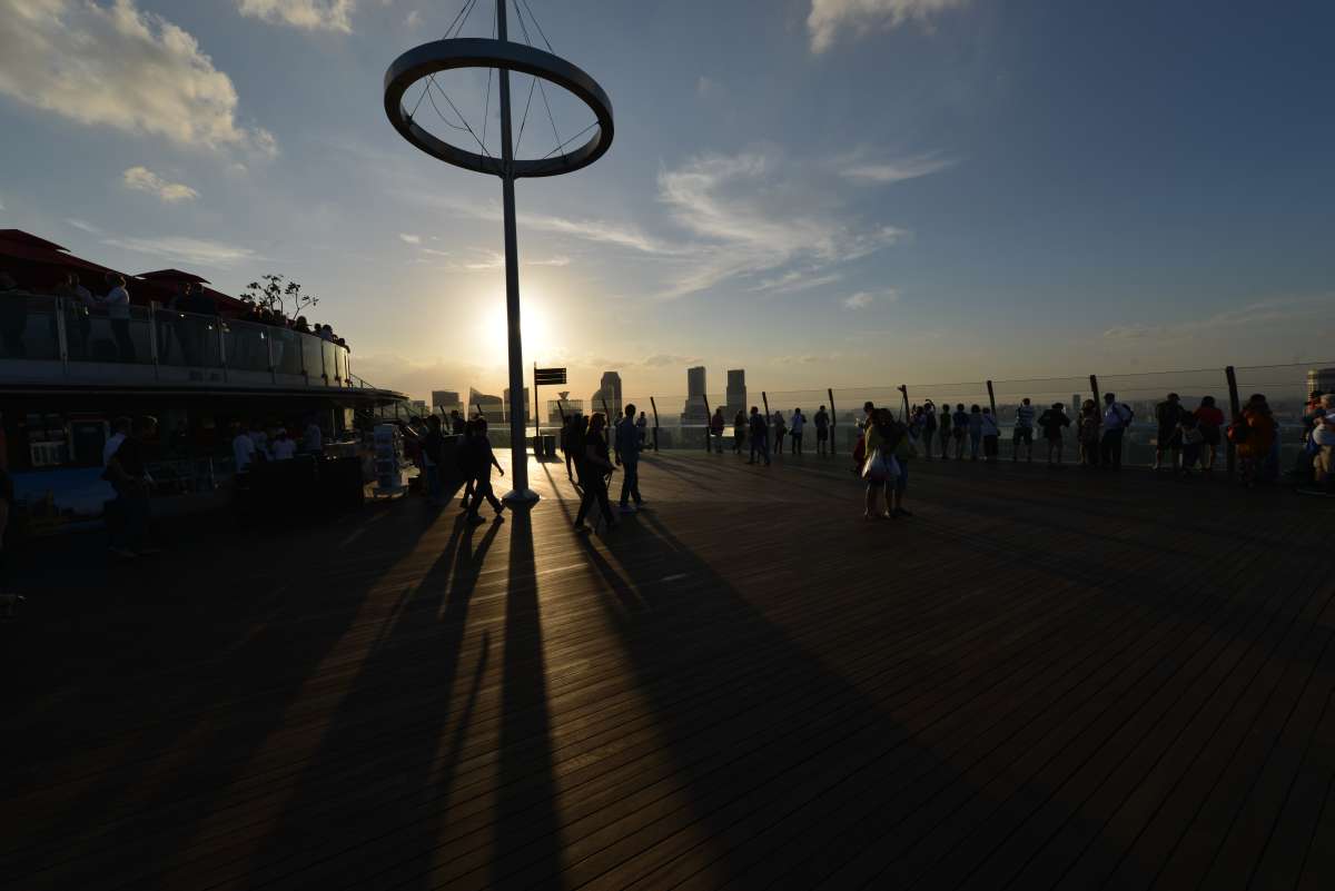 Die Sonne versinkt über der Skyline von DOWNTOWN SINGAPUR, wir haben genug Fotos gemacht und gesehen, also wieder runter auf den Erdboden und auf zum GARDENS AT THE BAY!