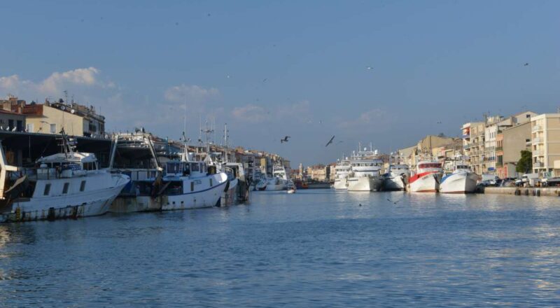 Zuerst kommt der kleine Berg MONT SAINT-CLAIR in Sicht, dann der große, aber sehenswerte Industriehafen zur Rechten und die Einfahrt in die Kanäle mit den großen Trawlern zur Linken.