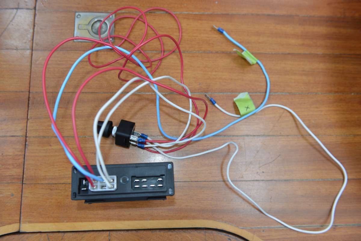 Die beiden roten Kabel sind für den Schalter S1 (Ein/Aus) und jetzt (richtig) auf Pin 1+4. Das blaue Kabel ist Minus an Pin 2 – da es in der Mitte ist, ist es immer richtig, ob spiegelverkehrt oder nicht. Die beiden weißen Kabel sind für die Steuerung der Kontroll-Lampe im Schalter und liegen auf Pin 3+6.