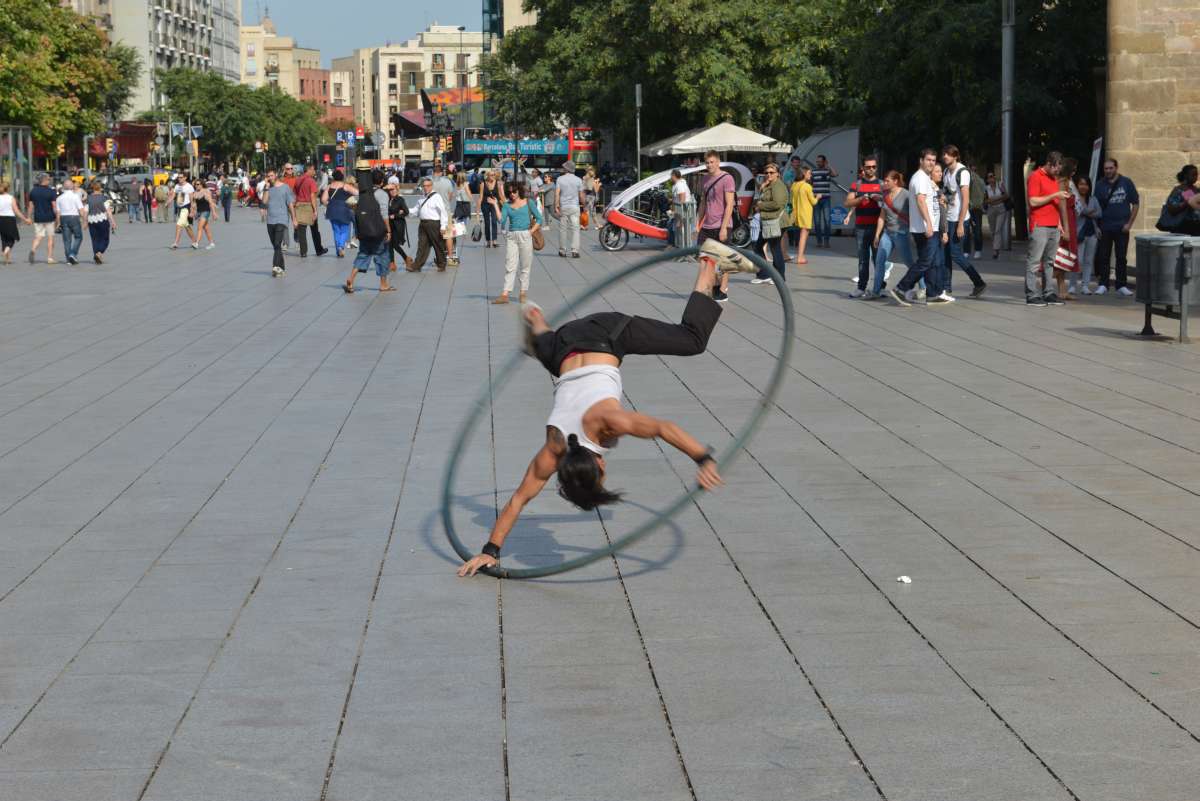 Als wir an der Kathedrale Santa Eulalia vorbei kommen, führen gerade zwei Artisten eine atemberaubende, weil ultra-schnee Show mit einem Reifen vor. Das ist Straßenartistik pur. Irre! Irre toll!