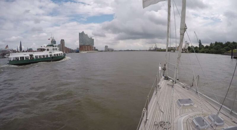 Die Crew der VOYAGER hat uns vorher auf der ELBE abgefangen und eskortiert – zwei wirklich weitgereiste Boote wühlen sich routiniert durchs kabbelige HAMBURGER HAFEN Fahrwasser als wäre es das normalste auf der Welt.