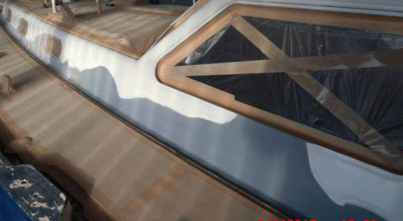 Wie gut, das alle Arbeiten von Seiten der Werft permanent im Bild dokumentiert werden und ich meine eigenen Fotos mache, wenn ich das Boot mal wieder besuche. Der STORMVOGEL ist immer noch in der Lackierhalle. Nach dem Vorschleifen wurden die Korrosionsflächen gestrahlt, grundiert und gespachtelt. Der Auftrag der Epoxyspachtelmasse ist wohl die wahre Kunst des Lackierers, denn die Flächen müssen vollkommen glatt werden und nahtlos an vorhandene Oberflächen anschließen. Immer wieder Zwischenschleifen und auf-spachteln. Das dauert seine Zeit, wenn es gut werden soll – und das soll es!