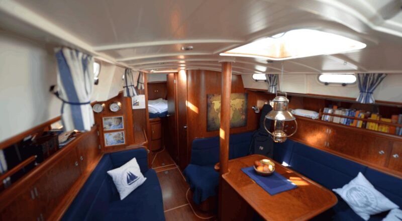 Der STORMVOGEL ist ein Langkieler und als solcher fährt er aus Stabilitätsgründen 6 Tonnen Bleiballast im Rumpf. „Stabilität“ meint im Boots- und Schiffsbau die Hebelkraft des aufrichtenden Moments. Also die Kraft, die verhindert, das ein Boot oder Schiff nicht einfach kentert – also umkippt. Moderne Yachten haben üblicher Weise einen tiefen Kiel in der Bootsmitte und unten als Abschluss eine Blei- oder Eisenbombe von +/- 2 Tonnen. Durch den langen Hebelarm ergibt sich genügend aufrichtendes Moment, um trotz des geringeren Ballastanteils ein solches Boot immer wieder aufzurichten.