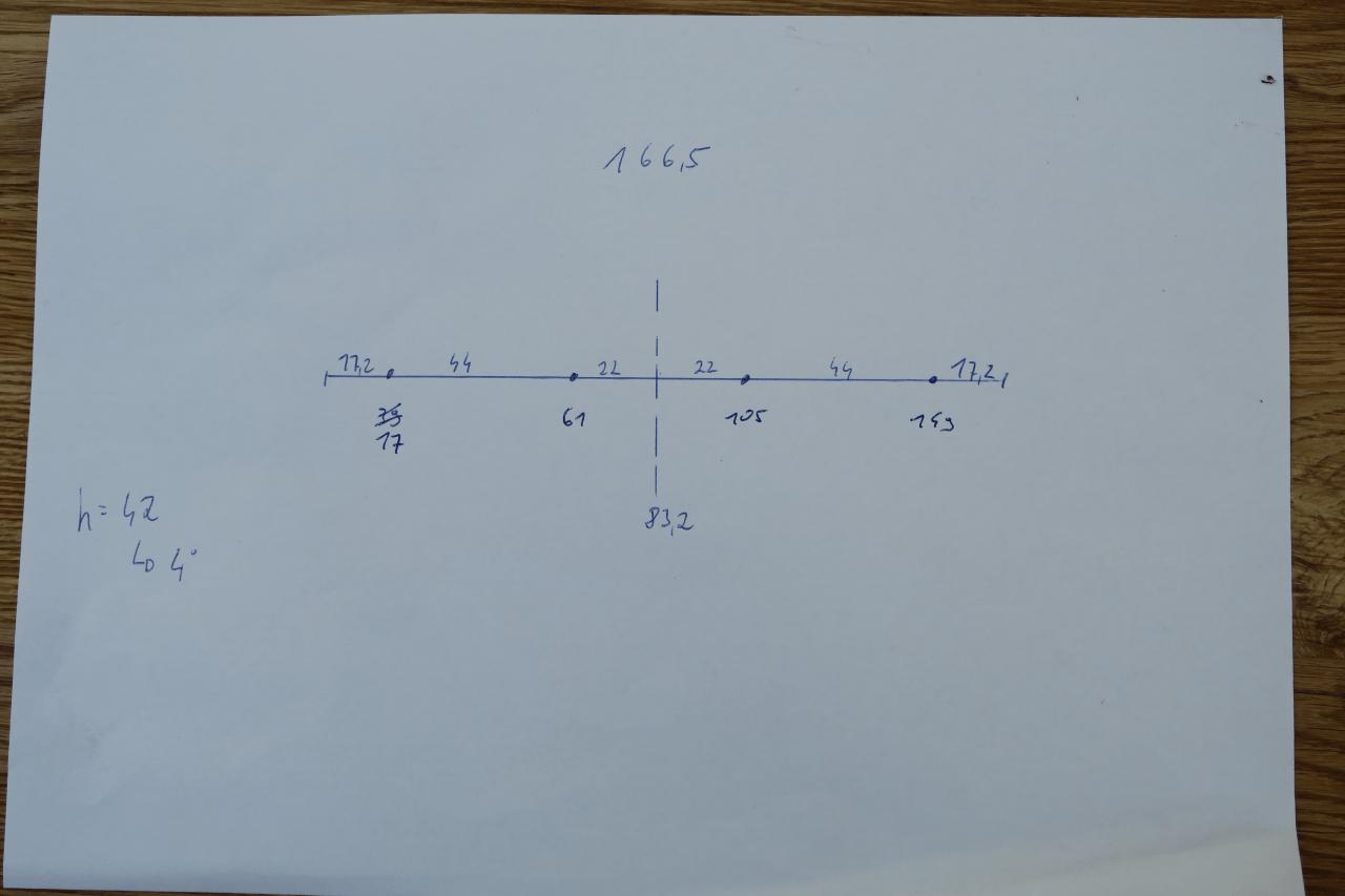 Die Sensoren dürfen maximal 44 cm voneinander entfernt sein, die Anschlüsse im Kabelbaum sind denn auch kaum länger. Mit einer Skizze dann das Positionierungsproblem gelöst: Von der Mitte der demontierten Stoßstange ausgehend, 22 & 44 cm nach links und rechts und gut ist.