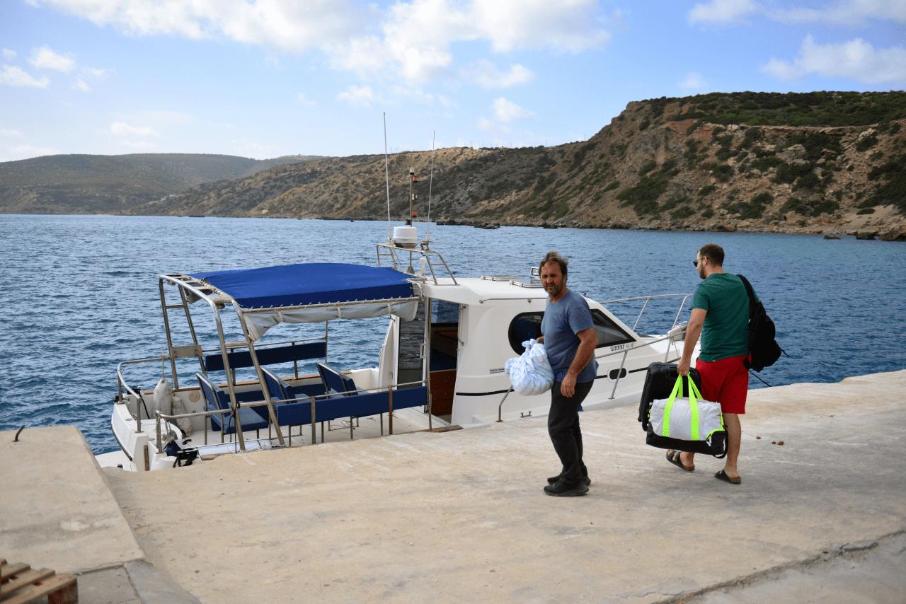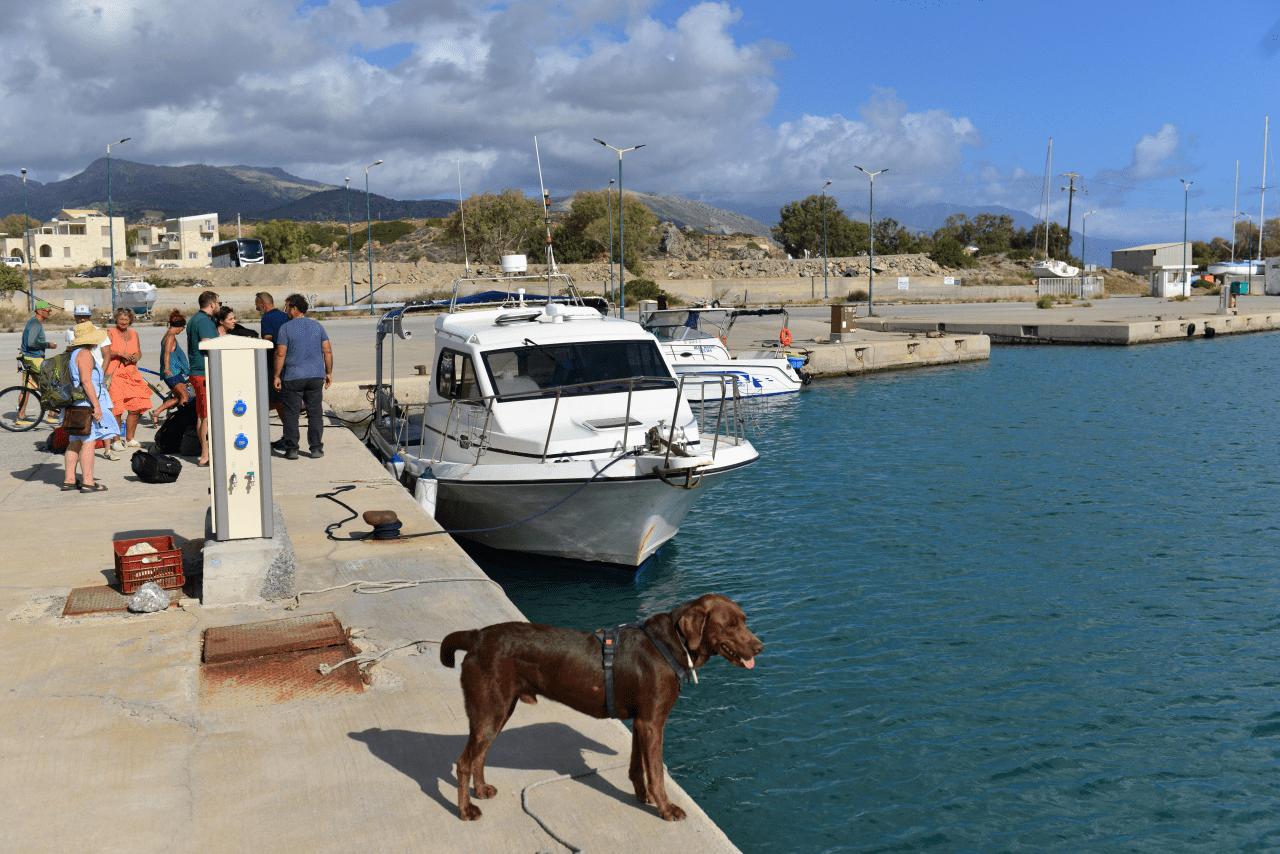 Das Boot im Hafen KARAVES von GAVDOS ist schon vom Liegeplatz zum Anleger vorholt, diesmal gibt es außer den beiden Fahrrädern nur das Gepäck der wenigen Reisenden sowie einen Seehund zu verladen und nach zehn, zwanzig Minuten geht es auch schon los.