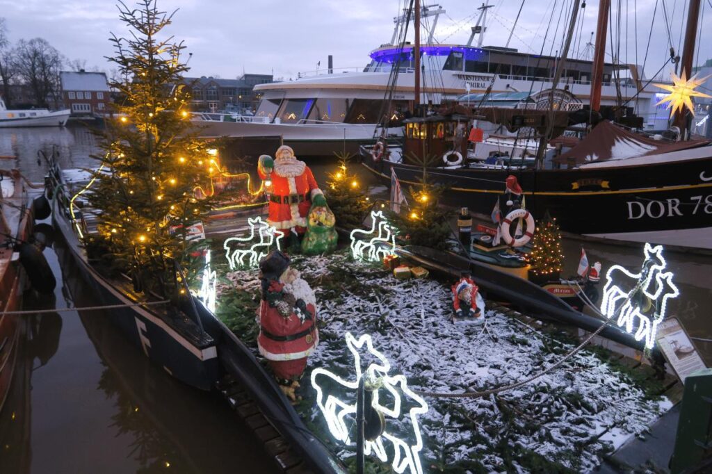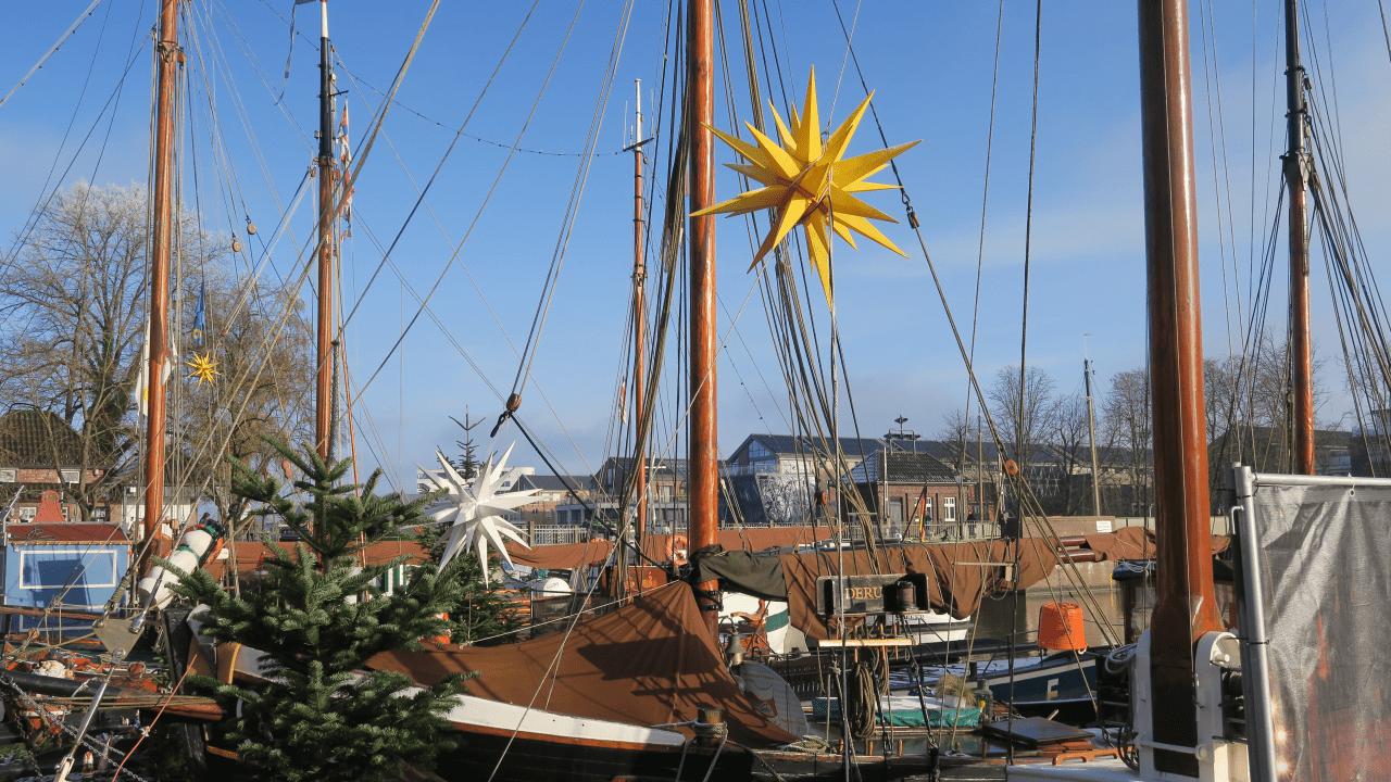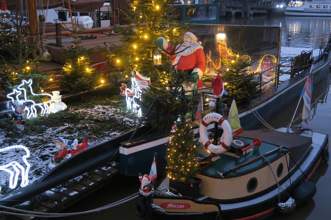 Der Samstag bringt etwas mildere Temperaturen und vor allem blauen Himmel! Die Innenstadt von LEER ist voll von Menschen und als es dämmert leuchten Millionen kleine Lichter der aufwendigen Weihnachtsdekoration. Genau so, also wirklich exakt so hat sich die kleine Reisegruppe das vorgestellt. Na ja, wieso der schönste Weihnachtsmarkt im Museumshafen von LEER erst am Sonntag um 1400 öffnet erschließt sich einem nicht, aber immerhin sparen die nicht am Strom und die alten Boote und Schiffe erstrahlen mindestens so feierlich wie die zahlreiche Tannenbäume umzu.