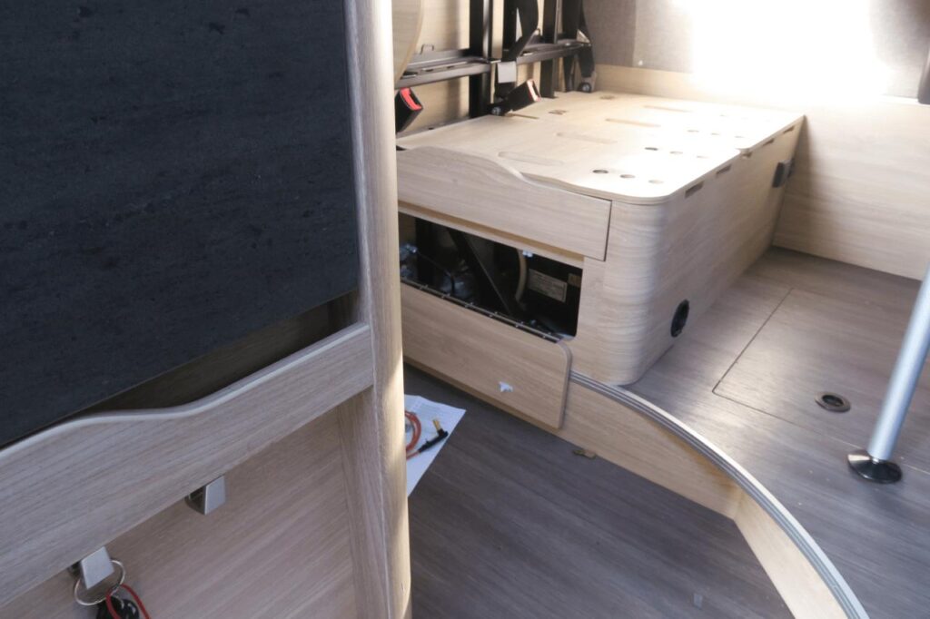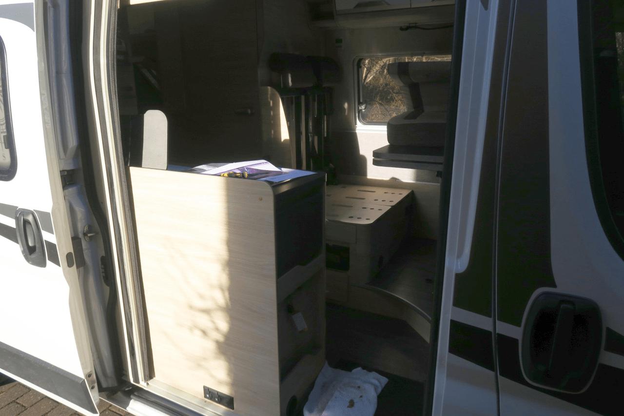 Offene Schiebetür beim DUCATO Wohnmobil, dahinter die Sitzbank (ohne Polster), darunter Heizung und Frostwächter