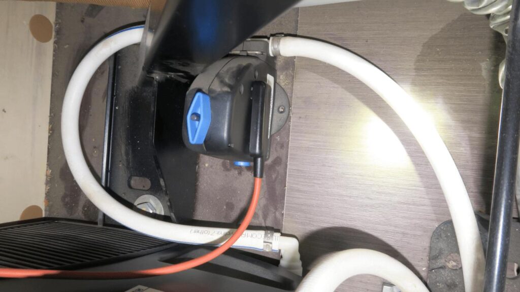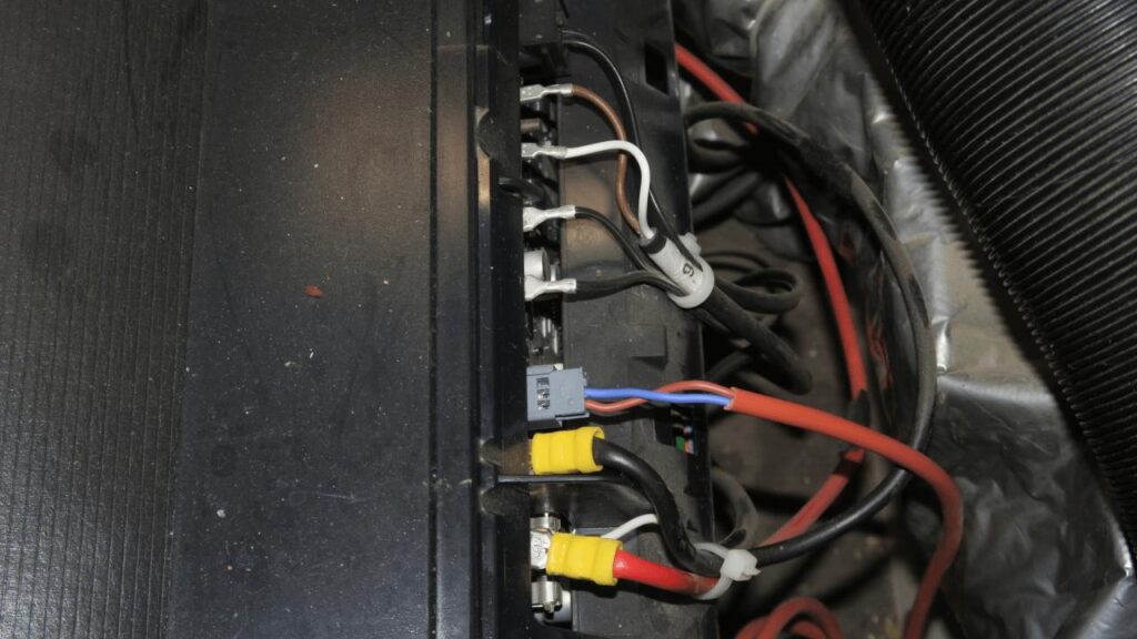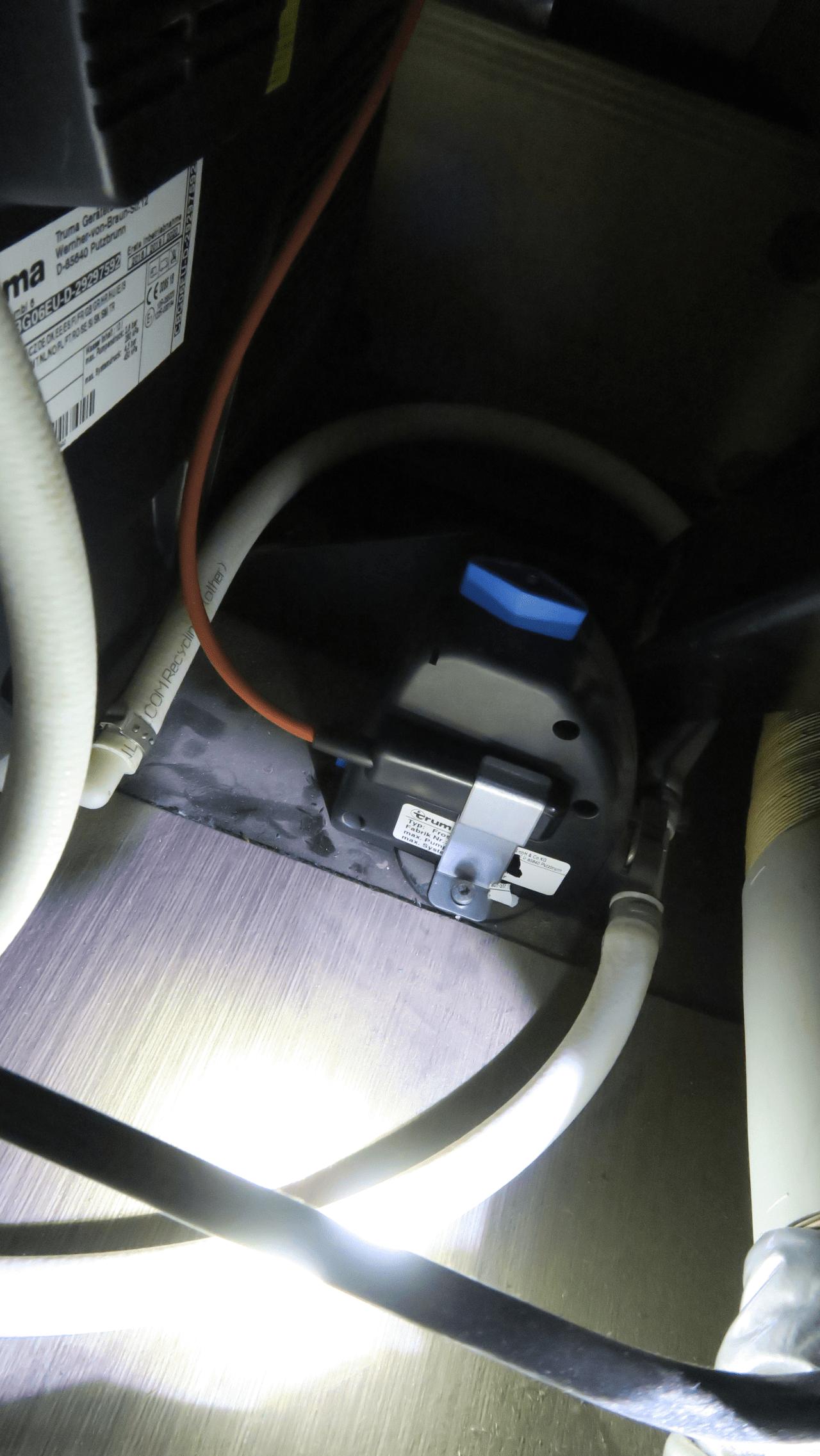 Elektrische Steckverbindung an der TRUMA Heizung für das Heizelement des Frostwächters (rotes Kabel, grauer Stecker)