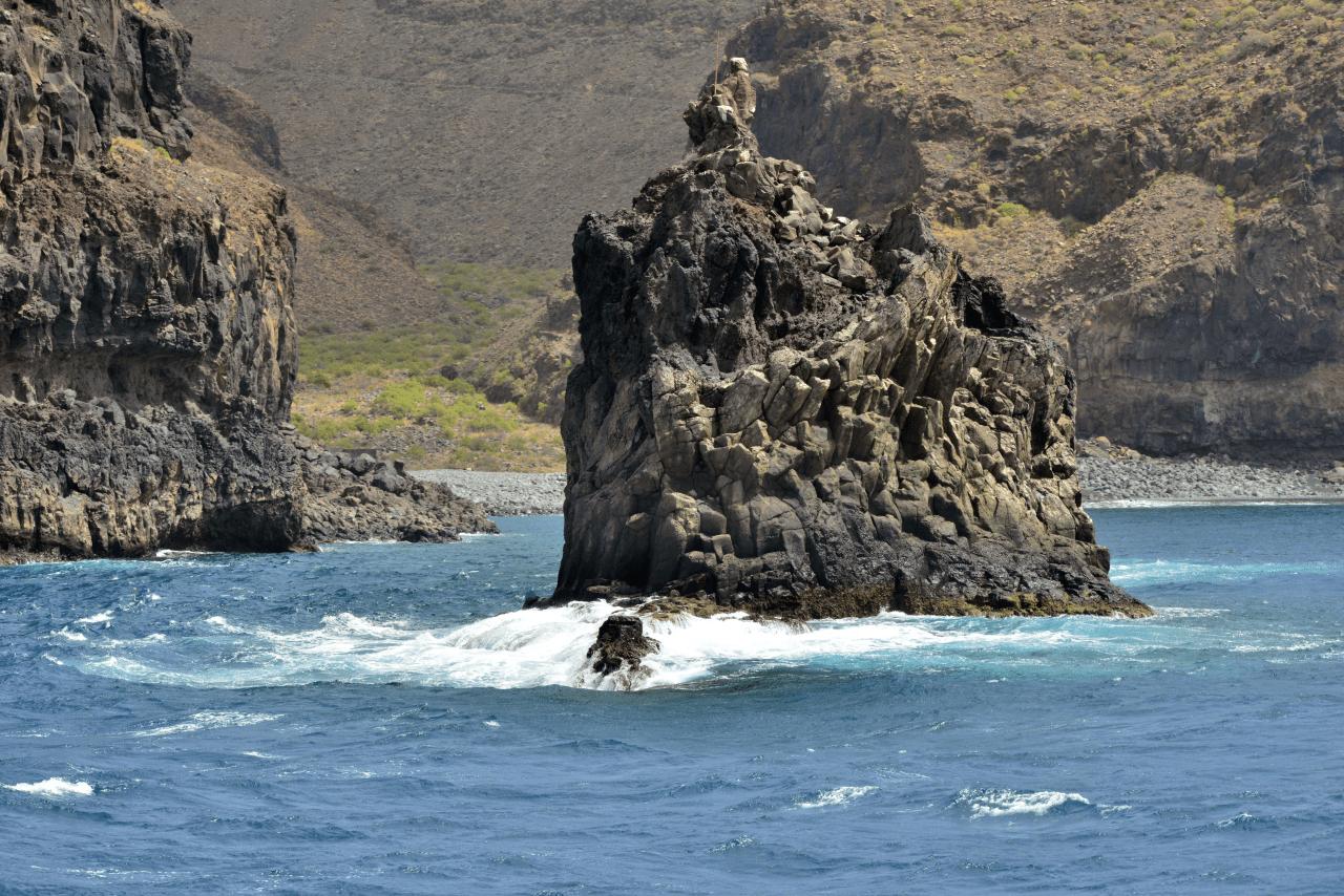 Nach schon dreißig Minuten wird PLAYA DE SANTIAGO erreicht, kurzer Zwischenstopp, wenig Passagierwechsel, und weiter geht es. Nach weiteren dreißig Minuten, in der Ansteuerung von VALLE GRAN REY wird die See recht kabbelig und der Wind frischt deutlich auf. Die BENCHI EXPRESS stampft mühevoll, nützt aber nix, erst muss der Kapitän noch so einen sehr einsamen Felsklotz vor der Küste umschiffen, erst dann kann er wieder dichter unter Land und dem wässrigen Ungemach entkommen. Mit reduzierter Fahrt, selbstverständlich.