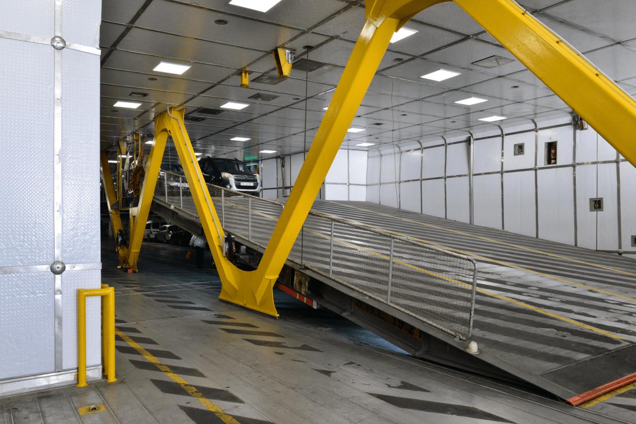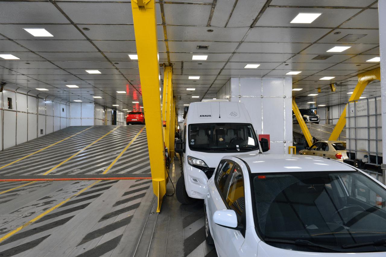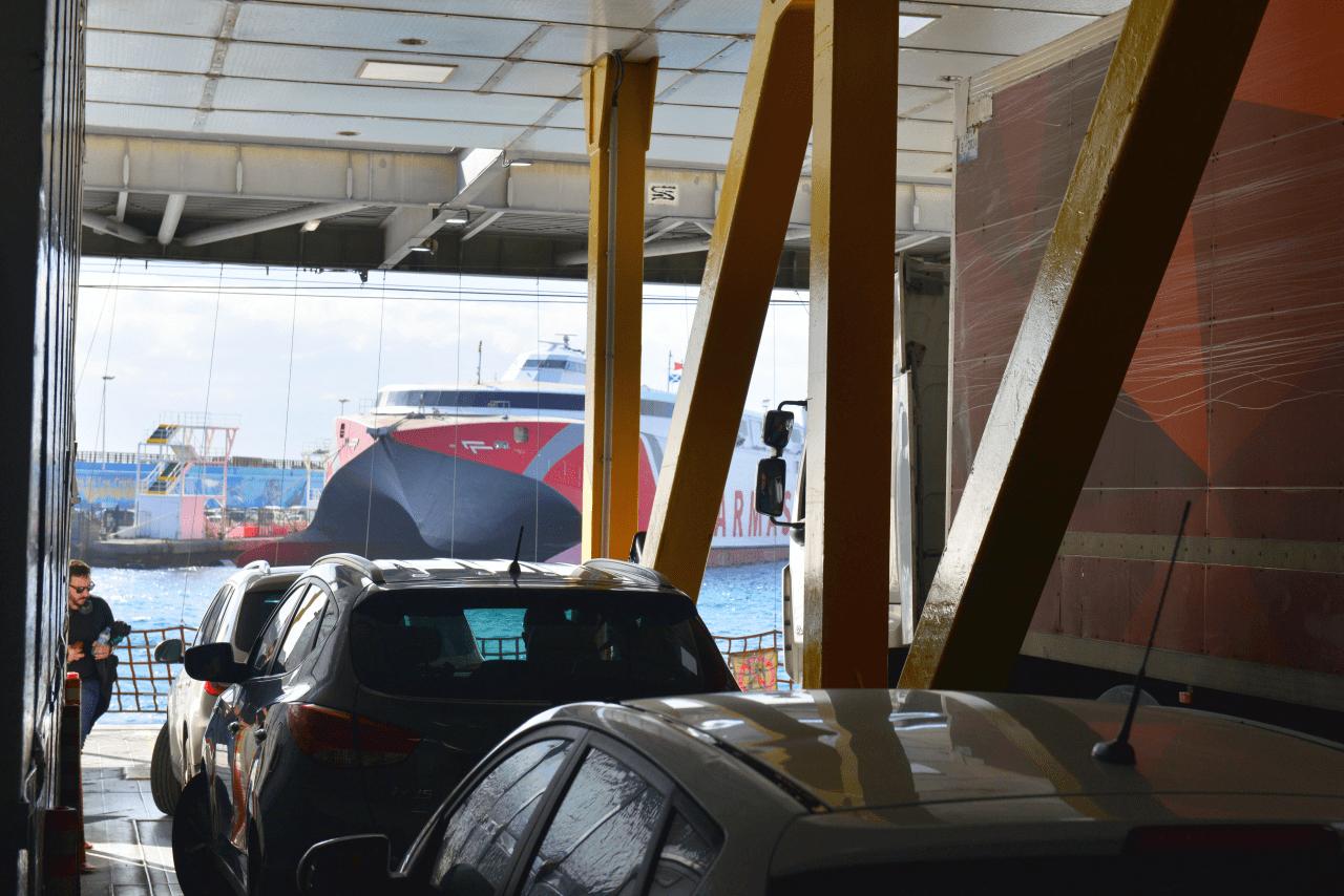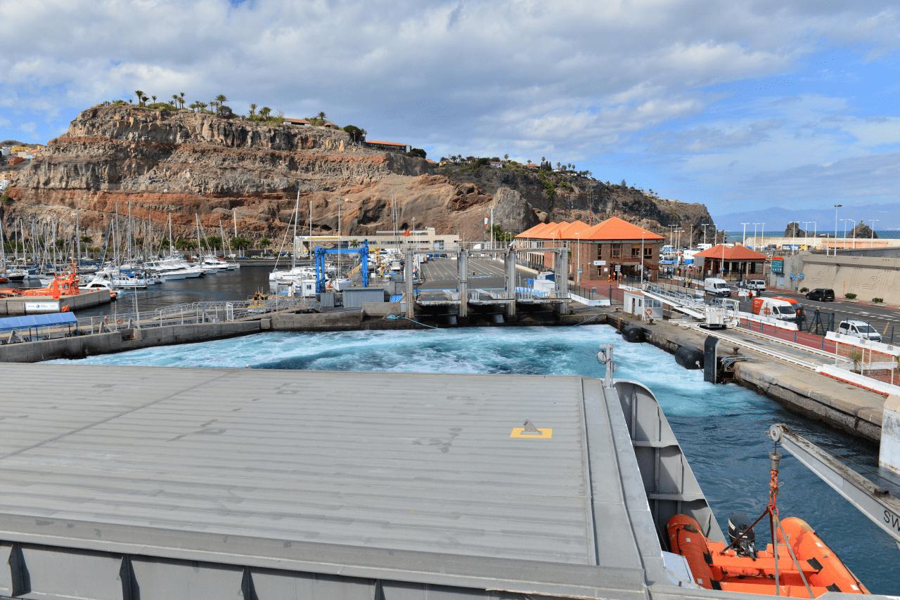 Als die kleine Reisegruppe am Hafen eintrifft, wird gerade die BENCHIJIGUA EXPRESS entladen und es wird klar, warum im Hafen von LA GOMERA der Wartebereich für das Verladen der Autos erst 1,5 Stunden vor Abfahrt der Fähre geöffnet wird: Ein großer Teil der Parkplatzfläche wird für das Entladen der Fähre benötigt. Eigentlich sind die meisten Fährhäfen auf den kanarischen Inseln ganz schön knapp an Landplatz.