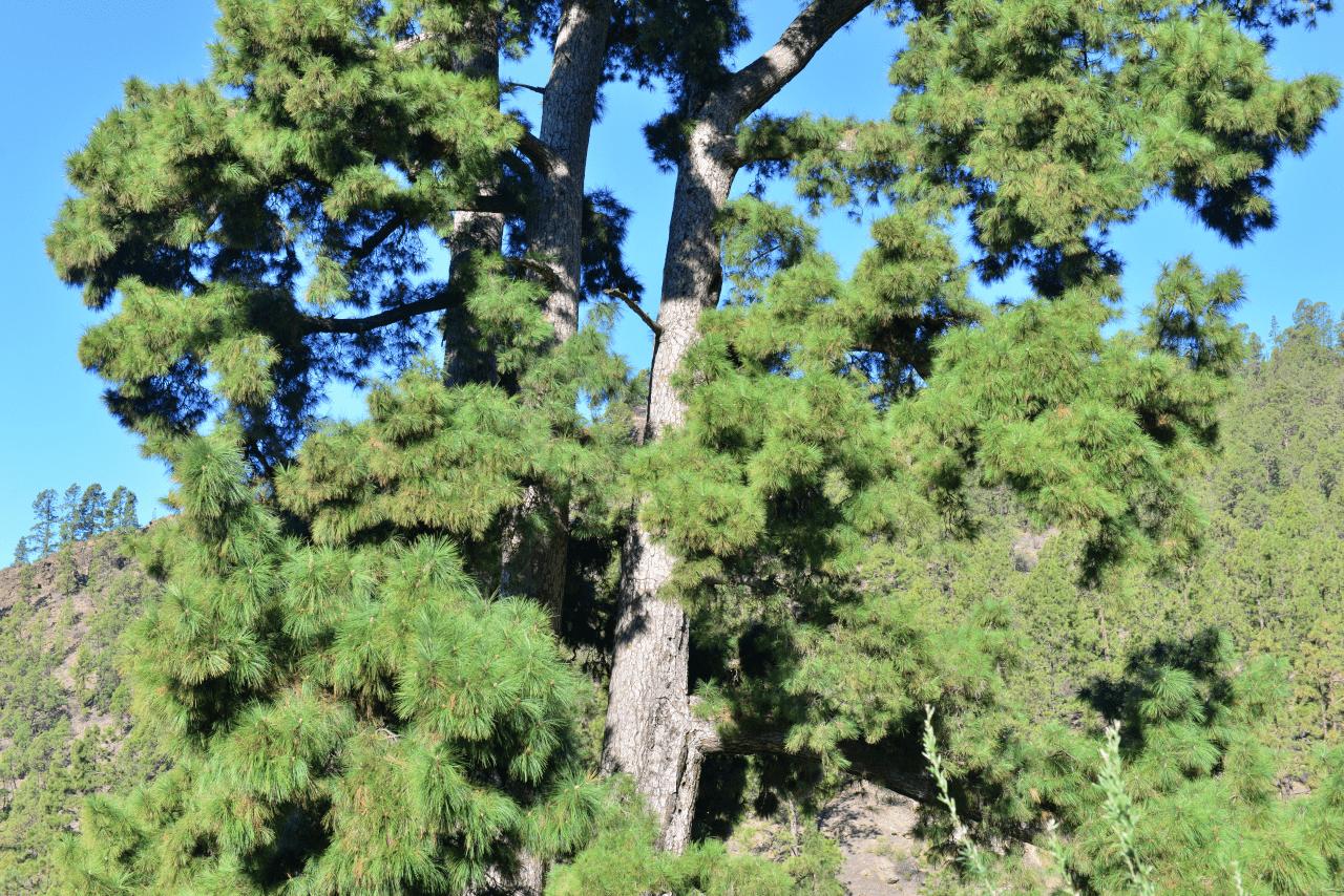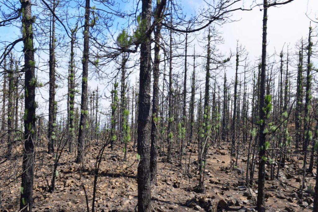 Die Endlose Abfahrt auf der Nordwest Seite der Insel führt eine Zeitlang durch einen großflächig verbrannten Wald, an vielen eigentlich verbrannten Bäumen kann man neue grüne Triebe erkennen.
