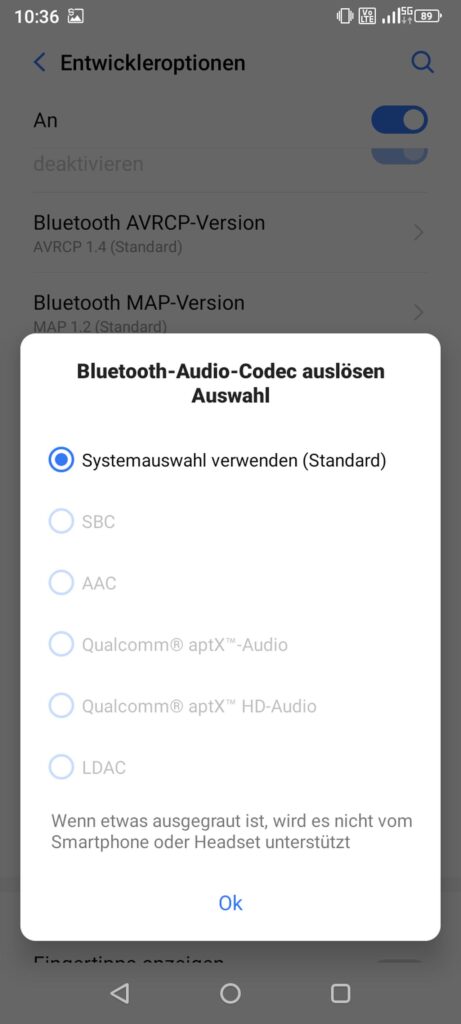 In der ANDROID Welt ist das leider viel, viel komplizierter, weil absolut undurchschaubar und auch nicht lösbar. Grundsätzlich definiert GOOGLE als ANDROID Hersteller welche BLUETOOTH AUDIO CODECS auf dem Gerät zur Verfügung stehen sollen. Offiziell soll z.B. bereits seit ANDROID 8 LDAC unterstützt werden.