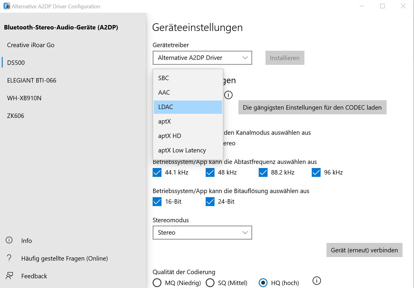 In der MICROSOFT Welt eines WINDOWS PC ist das schon echt blöd, aber immerhin lösbar. Denn MICROSOFT bietet in WINDOWS tatsächlich standardmäßig nur SBC an. Doch man kann für nur 8,50 € einen tollen AUDIO Treiber mit Namen „Alternative A2DP Driver“ von der Firma „Luculent Systems“ kaufen. Die namensgebende Abkürzung „A2DP“ ist hier echt verwirrend und steht für „Advanced Audio Distribution Profile“ – kann man aus Vereinfachungsgründen getrost wieder vergessen. Wichtig ist nur, das dieser Treiber WINDOWS ertüchtigt, alle (!) gängigen BLUETOOTH AUDIO CODECS zu verwenden, also „SBC“, „AAC“, „aptX“, „aptX HD“, „aptX Low Latency“ und „LDAC“.