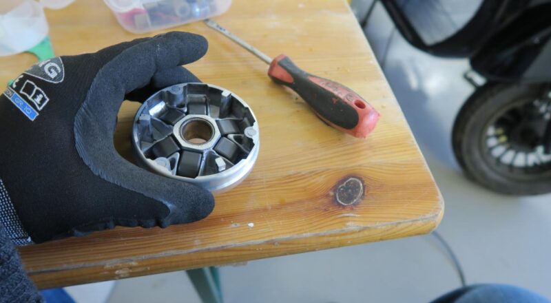 Jetzt den Zahnriemen zur Seite legen (hinten aber drauf lassen) und den Variator mit seiner Achshülse abziehen. Der Variator besteht aus zwei Teilen. Nimmt man die Kappe ab kommt man jetzt, tärä endlich an die sechs gesuchten Variatorrollengewichte.