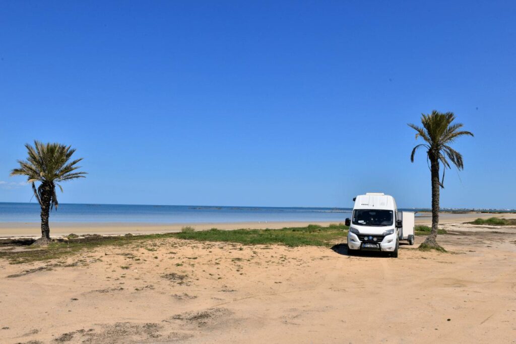 Für Wohnmobilfahrer ergeben sich auf flachen Inseln selbstverständlich manigfache Stellplatzmöglichkeiten direkt am Meer. So auch auf KERKENNAH. Jedoch, und dies sei hier nur einmal und ausdrücklich erwähnt: TUNESIEN hat ein massives Müllproblem. Wir können uns nicht erinnern so viel Müll in einer Landschaft gesehen zu haben wie hier. Da muss gehörig was schief gegangen sein und vermutlich geht die Müllentsorgung immer noch gehörig schief denn man sieht nicht nur alten Müll der da seit Jahrzehnten herum liegt sondern auch frischen. Hier und da gibt es spezielle Plastikflaschen Sammelcontainer. Nur sehr selten Mülltonnen. Unklar, ob die wirklich mal geleert werden (wohin?)?