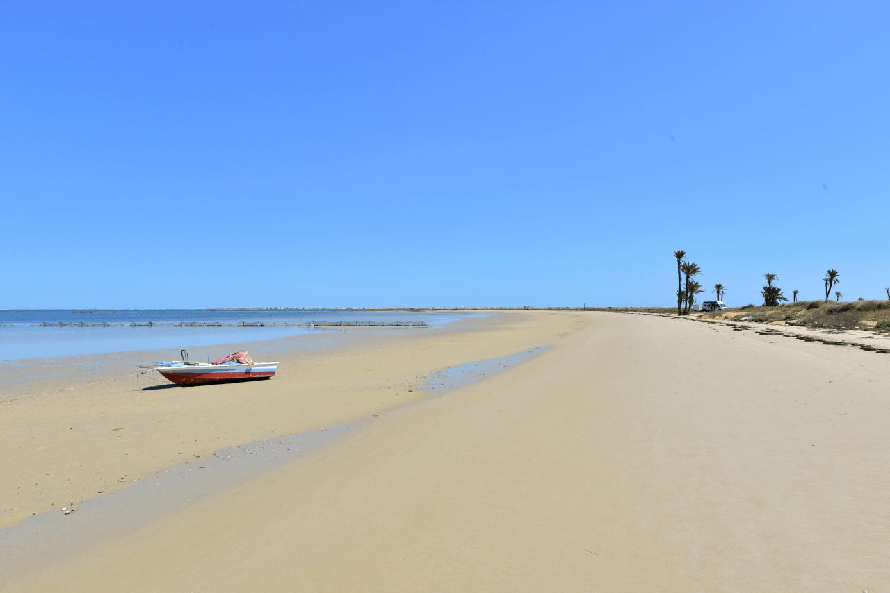 SISI FENKHAL Beach erreicht man nur über eine etwa 1 Kilometer lange feste Sandpiste am Ende der Strecke. Vermutlich der schönste, weil einsamste Ort auf der Insel? Auch hier ist ob des super flachen Strandes an ein Bade im Meere nicht zu denken.