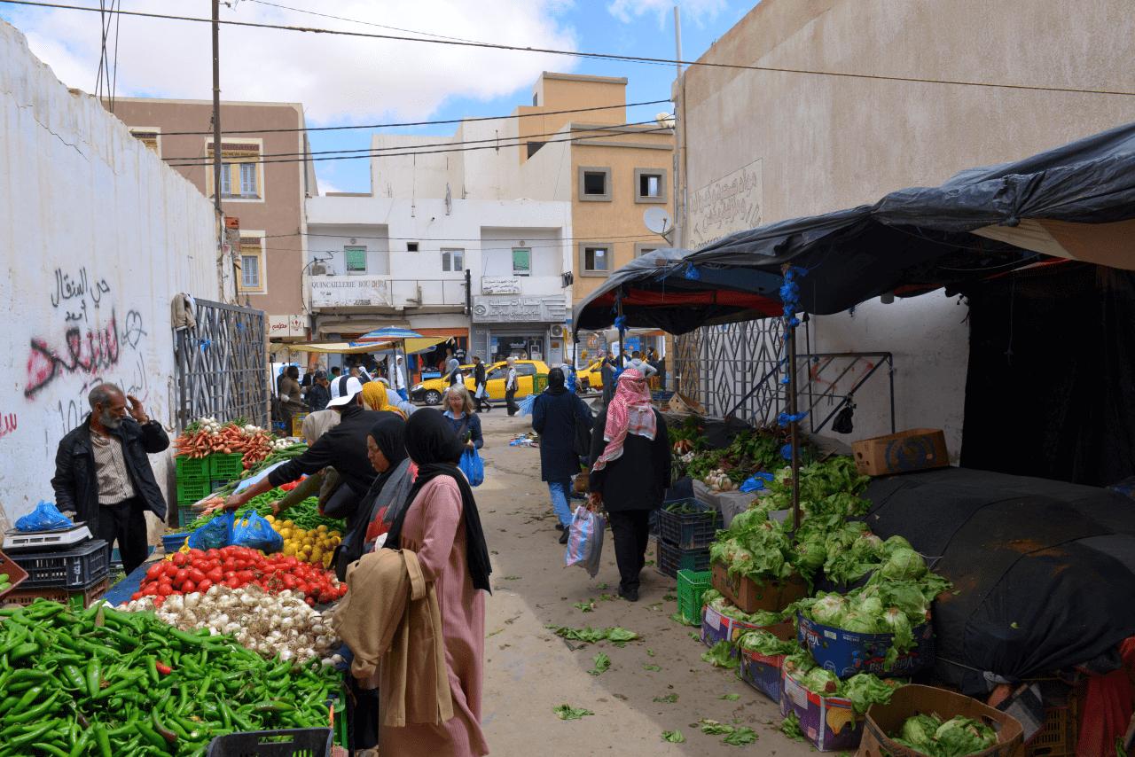 Nun, der Weg vom Westen nach Osten führt zurück über TATAOUINE. Auch wenn es in größeren tunesischen Städten immer Supermärkte gibt versuchen wir unsere Lebensmittel auf den Straßenmärkten zu kaufen. 1A Ware, Gemüse zu günstigen, Fleisch zu fairen Preisen. Nur muss man diese Straßenmärkte erst mal finden. Je größer die Stadt, je größer die herumkurverei. Einfaches Navigationsmittel: Immer da hin wo sich ein Gewühl an Autos und Menschen abzeichnet.