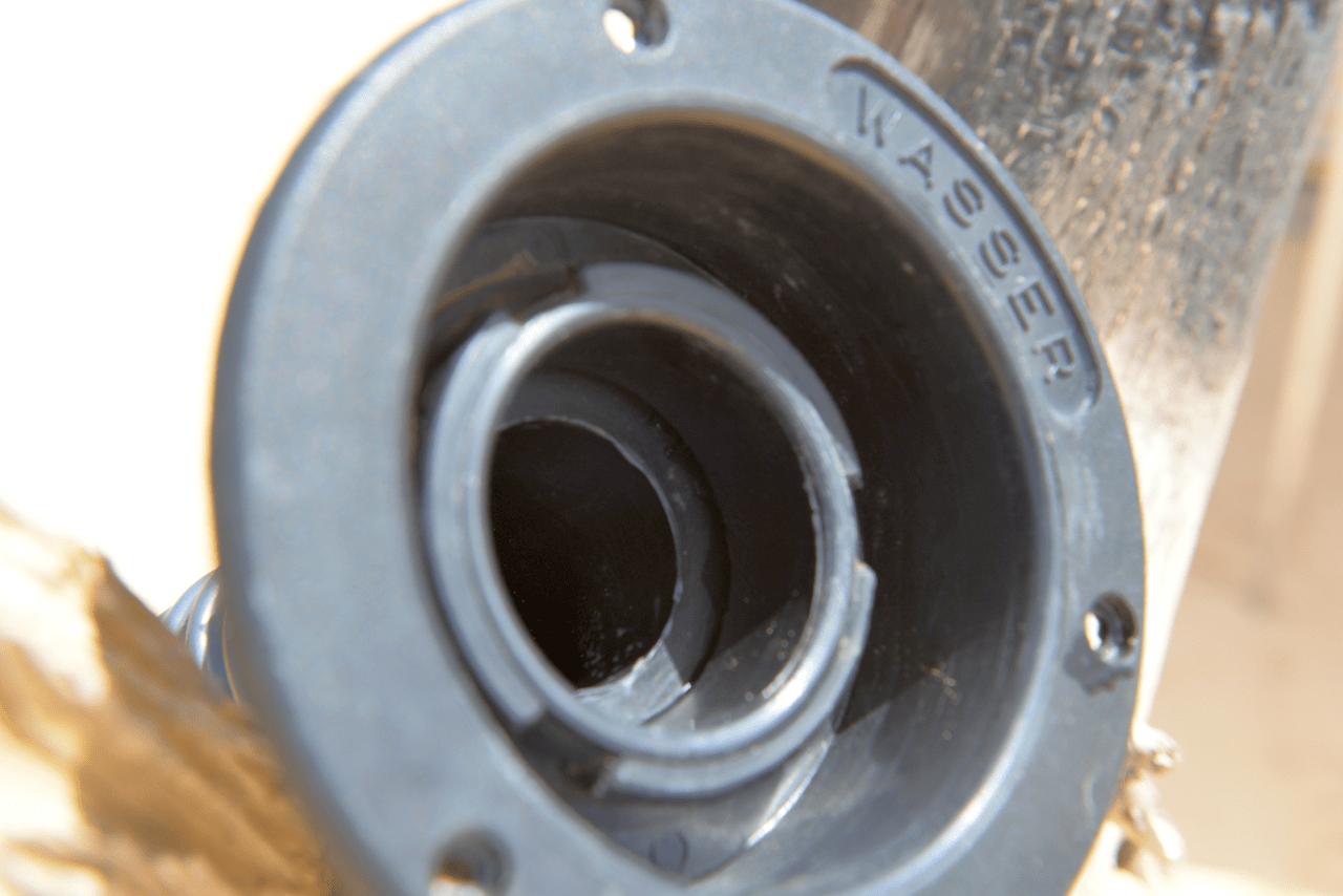 Genauso der Zulaufschlauch (Länge: 550mm, Innendurchmesser: 40mm, Außendurchmesser 45mm): Der ist zwar als Spiralschlauch ausgelegt, aber auch etwas zu kurz. Vermutlich hat man das gemacht, damit keine Senke entsteht und das Wasser gar nicht mehr in den Tank läuft.
