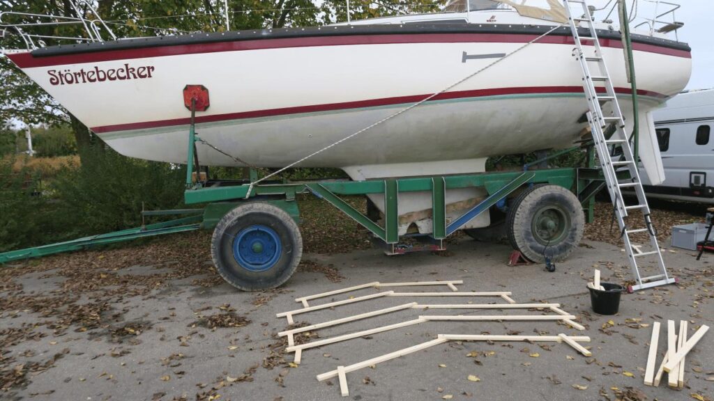 Alle sind glücklich, das das Boot nun richtig gut, in der richtigen Position auf dem Hafentrailer steht! Das ist nicht nur für diesen Winter wichtig, sondern auch für den anstehenden Anbau der Rungen: Jetzt weiß man ganz genau, wo die hin müssen und wie groß sie werden müssen, um das Boot an seiner Sollposition optimal zu halten.