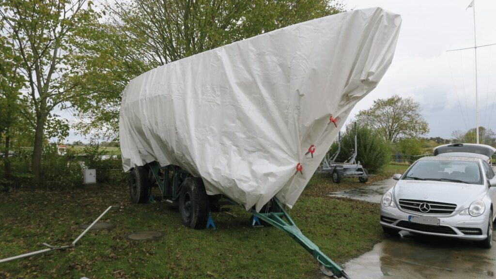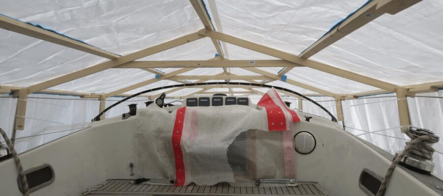 Nun, heraus kommt ein schicker Dachstuhl aus einfachen Konstruktionslatten, darauf eine riesige Plane. Die Überlegung: Wenn die Plane an beiden Seiten weit genug über den Bootsrumpf überlappt, kann starker Wind weniger Schaden anrichten? Schauen wir mal, während das hier gerade geschrieben wird stürmt es draußen heftig 😉