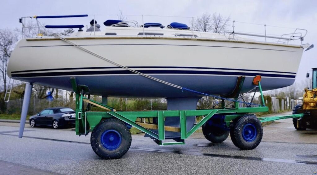 Allen ist klar, das die Aktion nur in einem Trail & Error Verfahren gelingen kann. Das das Boot gleich im ersten Versuch richtig auf dem „neuen“ Hafentrailer zu stehen kommt ist eher ausgeschlossen. Der Hafentrailer hat zu viele Einstellmöglichkeiten zur Fixierung des Bootes, diese kann man zwar auf Verdacht so gut wie möglich einstellen, wird aber wohl nie die richtige Position auf Anhieb treffen.