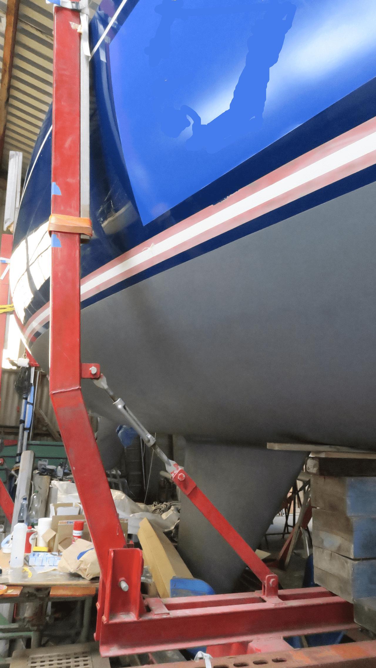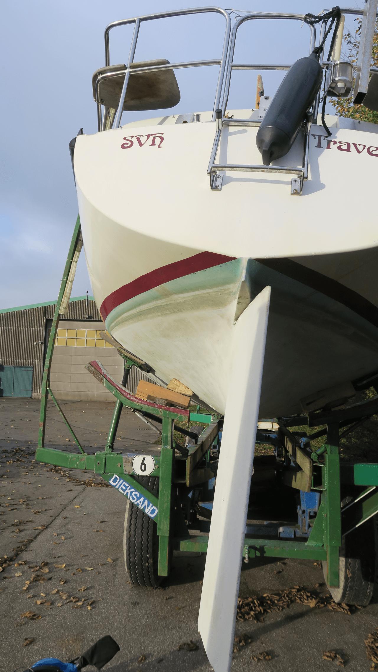 An Tag eins stand er zwar nach drei Versuchen sicher auf dem Bootswagen, aber doch recht schief und nicht genau da, wo er hin sollte. Das sah´ nicht nur sch…. aus, es war auch äußert unschön auf dem schiefen Deck herum zu laufen. Das Problem war das wir STÖRTEBECKER nicht weit genug nach vorne auf den Hafentrailer bekommen hatten weil die vorderen Bratzen (Stützen) nicht weit genug offen waren, die vordere Halterung (die, von der das große Holzteil beim Transport abgebrochen war) zunächst das Weiterkommen behinderte und der vordere Teil des Kiels auf dem vorderen Teil des Hafentrailers aufsetzte.