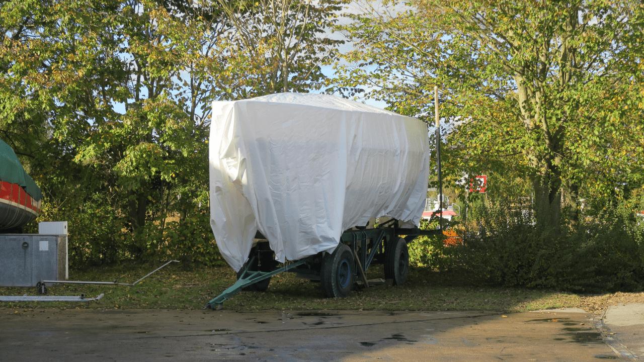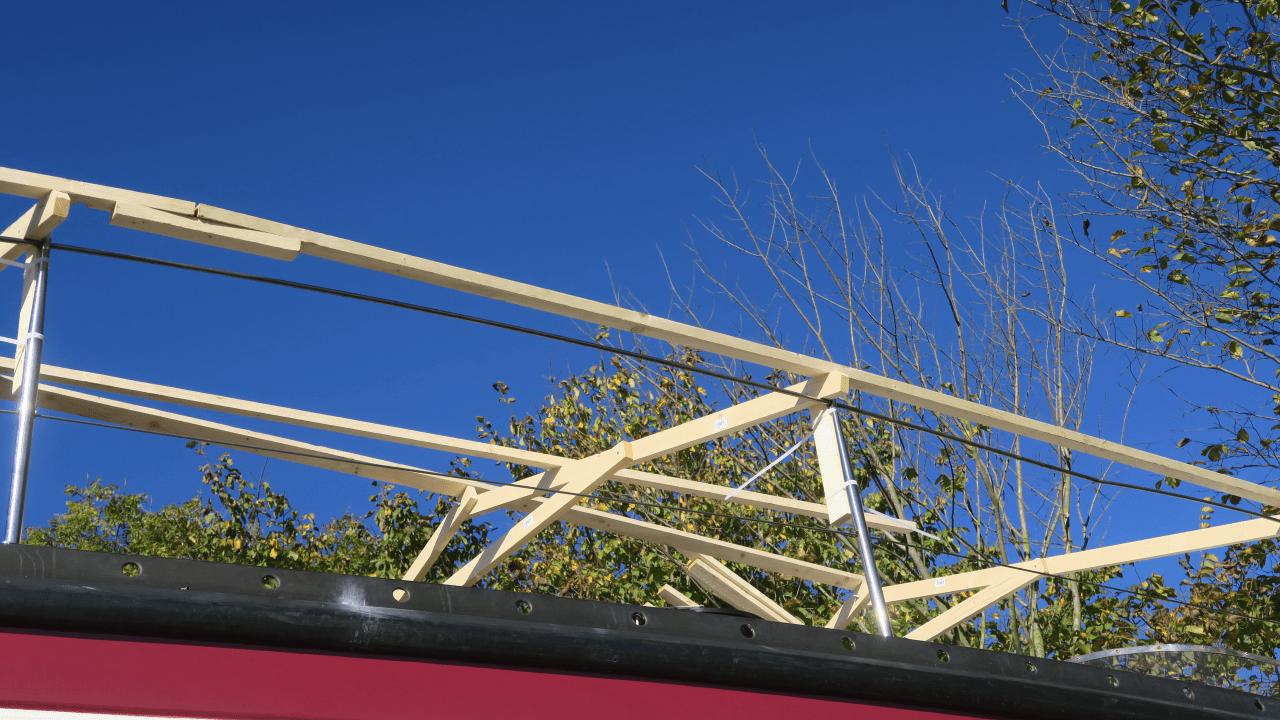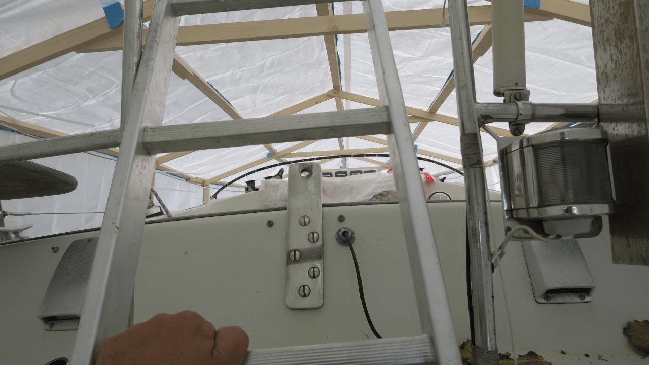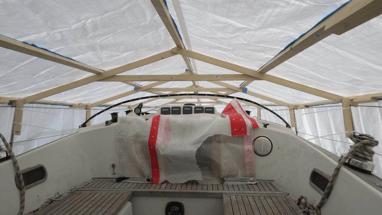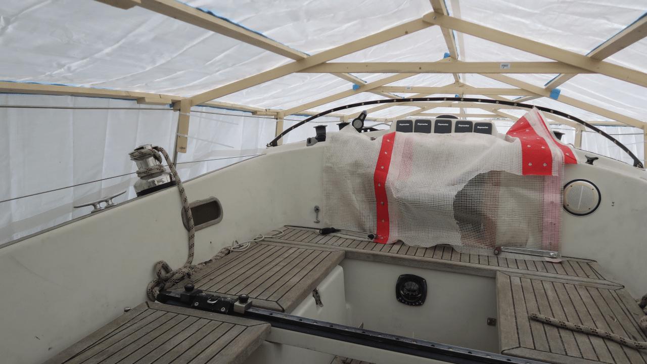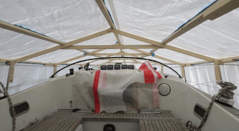 Nun, heraus kommt ein schicker Dachstuhl aus einfachen Konstruktionslatten, darauf eine riesige Plane. Die Überlegung: Wenn die Plane an beiden Seiten weit genug über den Bootsrumpf überlappt, kann starker Wind weniger Schaden anrichten? Schauen wir mal, während das hier gerade geschrieben wird stürmt es draußen heftig 😉