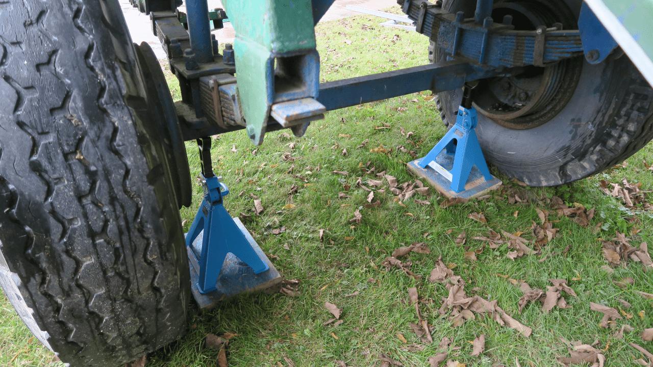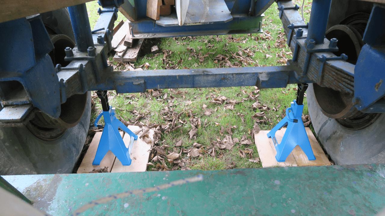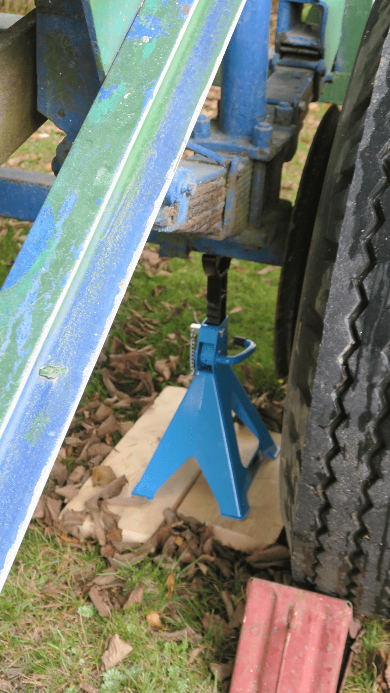 Von Wolfgang 2 lernen wir, das es sehr sinnvoll ist die Reifen der Hafentrailer durch massive Holzbalken oder Stahlstützen zu entlasten. Aber auf keinen Fall ganz aufbocken, so die Anweisung. Mit vier schicken 6 Tonnen Stützen auch das noch erledigt, jetzt soll es aber auch erst mal gut sein mit dem Einwintern!