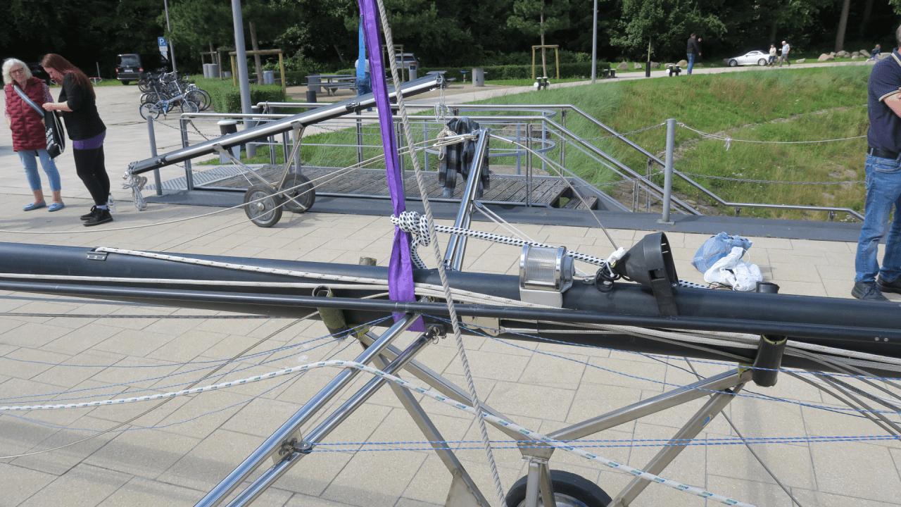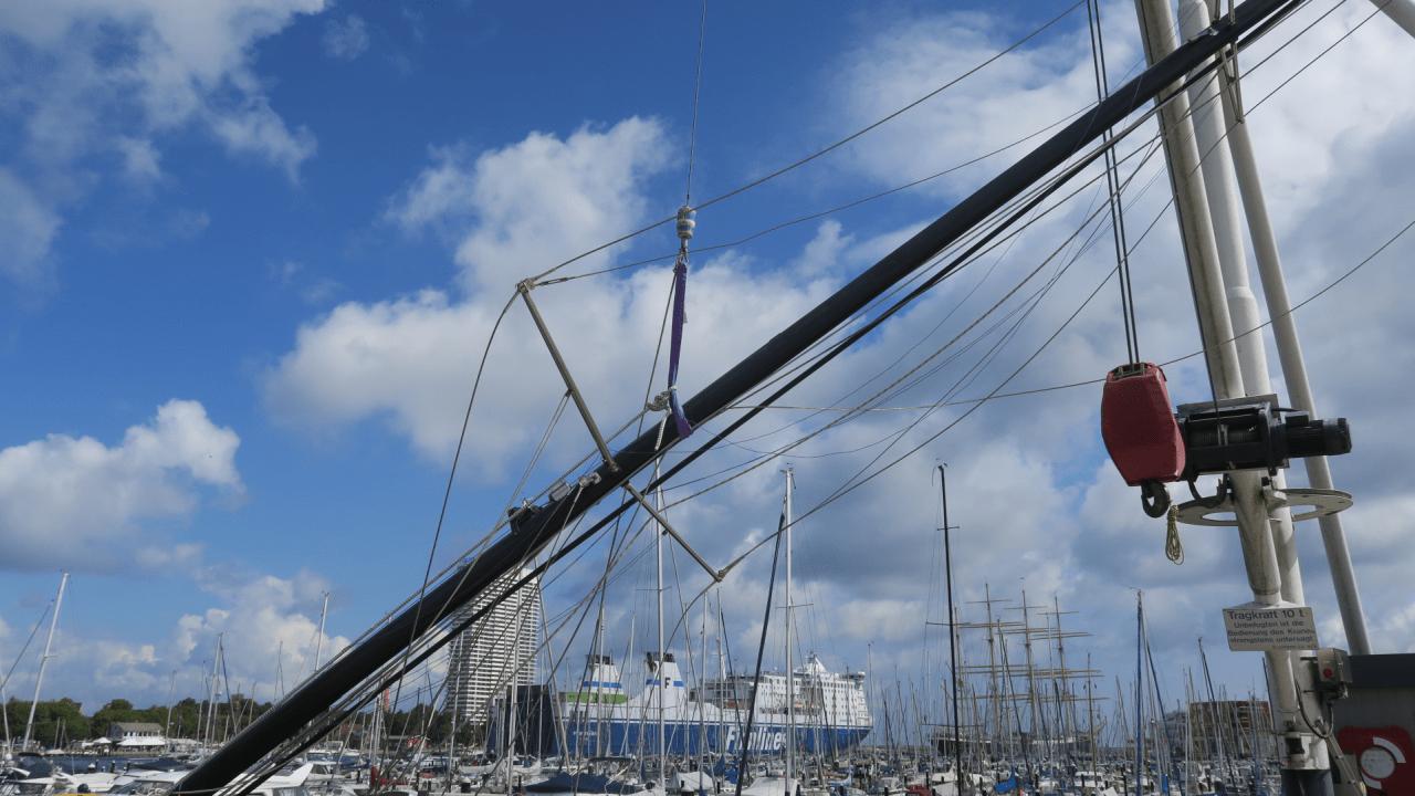 Es gibt Außenwinterlager, in denen Boote mit stehendem Mast an Land gelagert werden. Das kann nicht gut für das Material sein. Also haben wir bei unseren bisher vier Booten immer den Mast im Winterlager gezogen. Dazu müssen alle Drahtseile (Wanten), die den Mast in Position halten abgebaut werden. Mittels eines Mastkrans wird der Mast dann aus der senkrechten in eine horizontale Lage an Land gebracht. Angesichts der sperrigen Form einer 16 Meter langen Aluminiumstange tut man gut daran, ein paar mehr helfende Hände bereit zu halten: