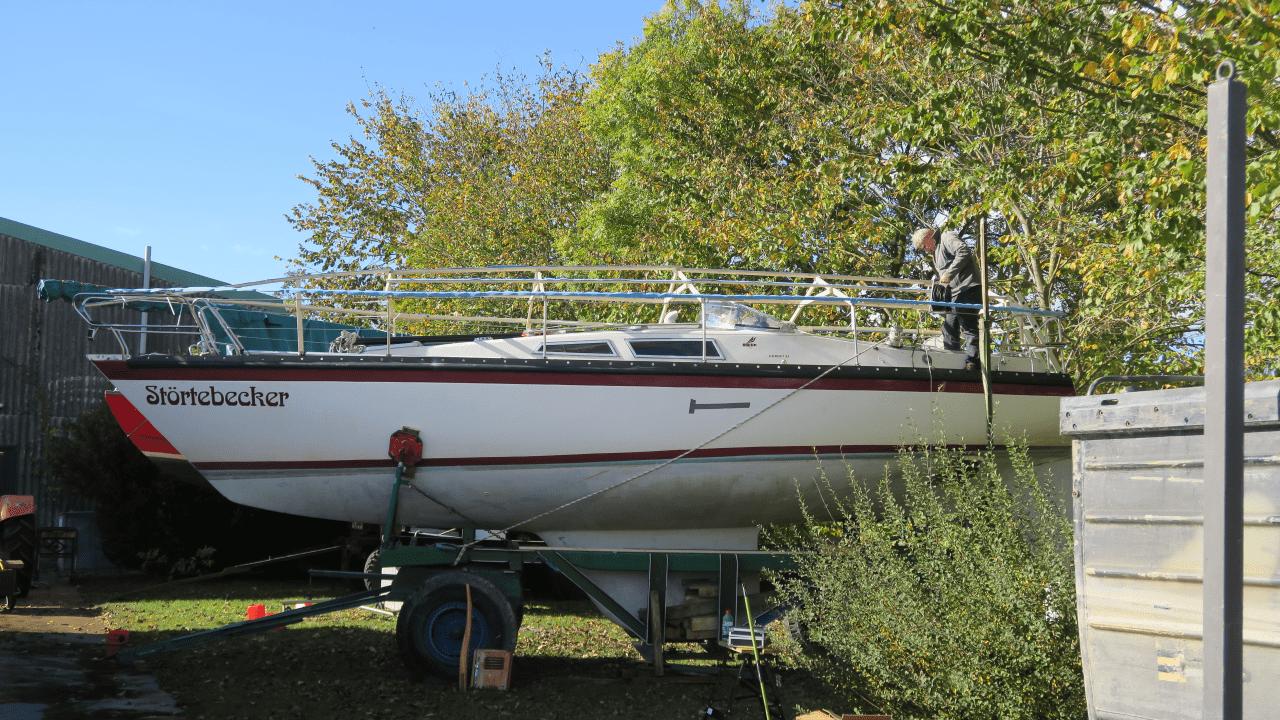 Alle sind glücklich, das das Boot nun richtig gut, in der richtigen Position auf dem Hafentrailer steht! Das ist nicht nur für diesen Winter wichtig, sondern auch für den anstehenden Anbau der Rungen: Jetzt weiß man ganz genau, wo die hin müssen und wie groß sie werden müssen, um das Boot an seiner Sollposition optimal zu halten.