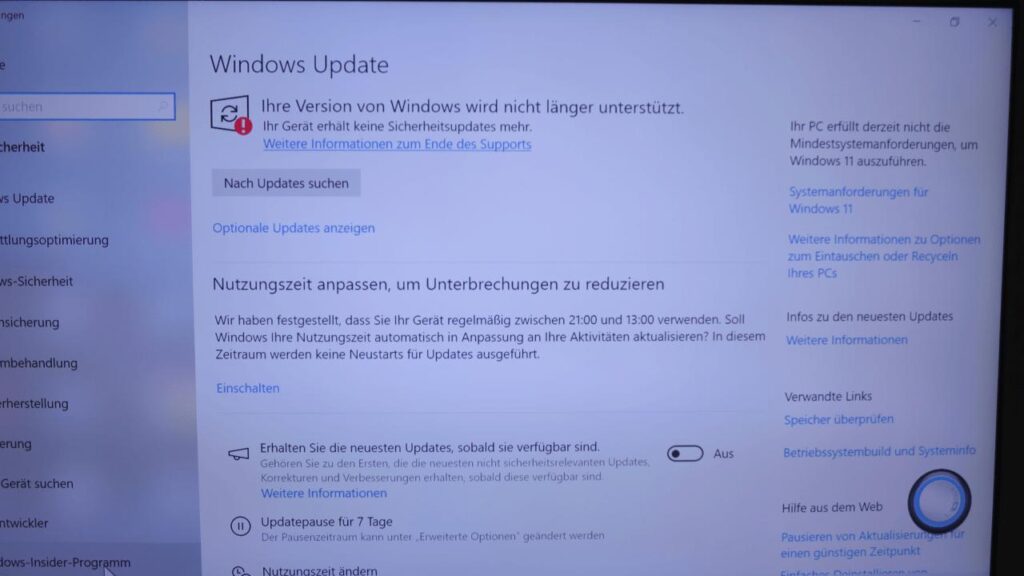 Meldet man sich hingegen mit dem anderen lokalen Konto auf dem gleichen PC an, erscheint nur die Warnmeldung „Ihre Version von WINDOWS wird nicht länger unterstützt.“
