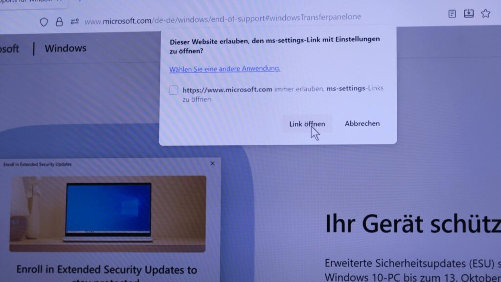 4) Dann erscheint eine Fragebox um einen „ms-settings-Link“ lokal auf dem eigenen Computer auszuführen. Auf den Button „Link öffnen“ klicken.