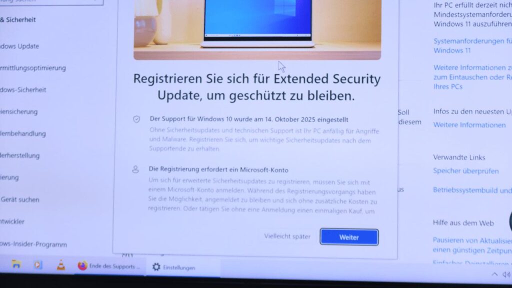 5) Im Dialogfenster „Registrieren Sie sich für Extended Security Update, um geschützt zu bleiben.“ den Button „Weiter“ klicken.