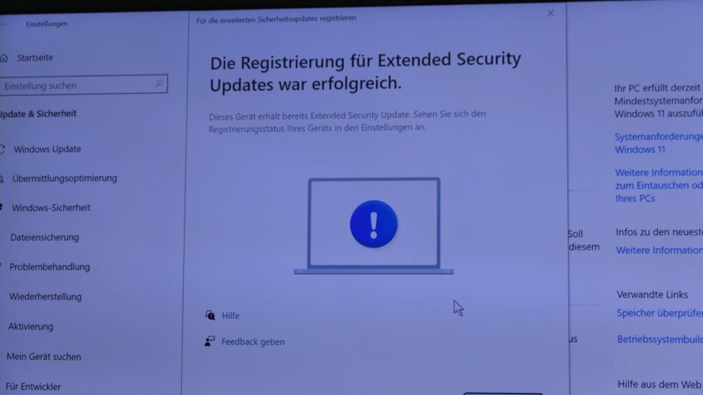9) Geht man dann danach erneut auf „EINSTELLUNGEN -> UPDATES & SICHERHEIT“ wird oben Rechts der Text „Ihr PC ist für erweiterte Sicherheits-Updates registriert.“ angezeigt und man ist nun für 12 Monate mit diesem PC auf der sicheren Seite.