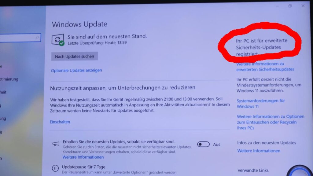 P.S.: Ergänzung: Nach dem ich zweiten PC mit den beiden lokalen Accounts aus Versehen ein paar Stunden im Leerlauf eingeschaltet hatte, hat MICROSOFT nun auch bei dem zweiten Account die Anzeige auf „Ihr PC ist für erweiterte Sicherheits-Updates registriert.“ geändert. Sehr schön, obwohl es ja vielleicht genau das ist was einen beunruhigt: Das von einem externen System Änderungen auf der eigenen, lokalen Hardware vorgenommen werden.