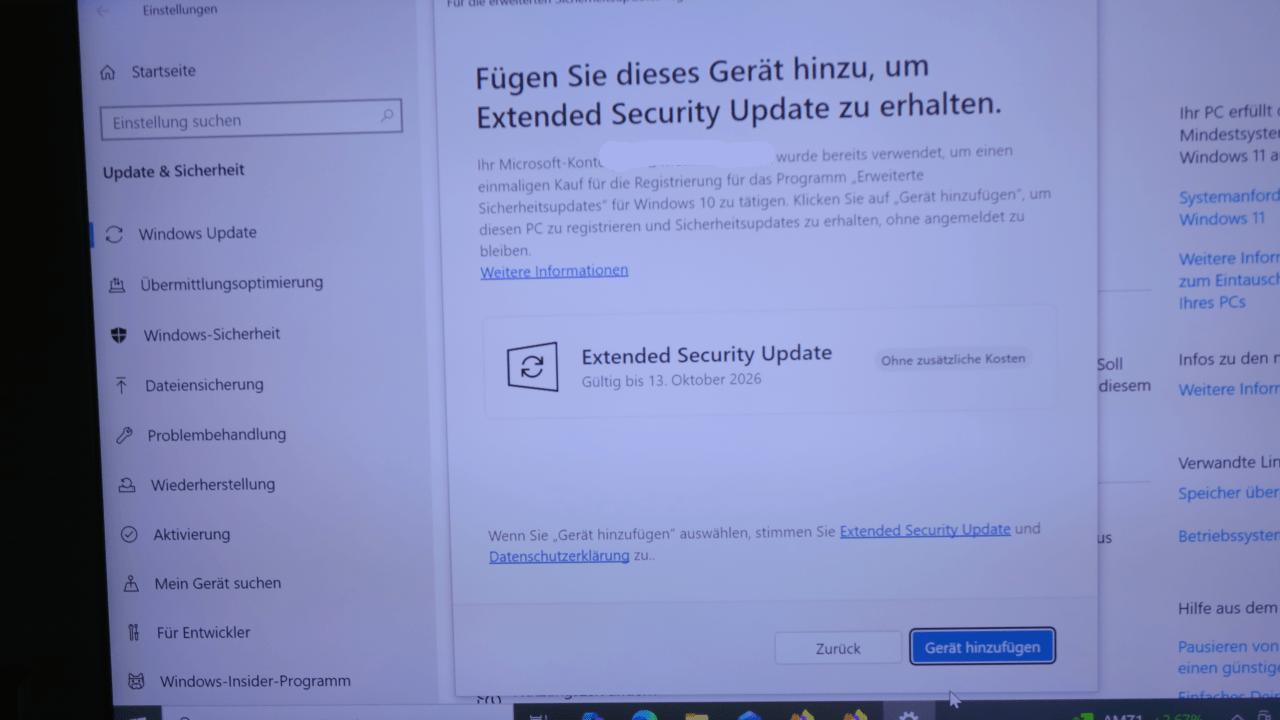 Nach dem erfolgten Login mit dem online MICROSOFT Konto erscheint dann die Nachfrage, ob man diesen PC zu MICROSOFT 10 ESU hinzufügen möchte. Ist dem so, klickt man den Button „Gerät hinzufügen“ und auch dieser PC wird ein weiteres Jahr mit Sicherheitsupdates versorgt.