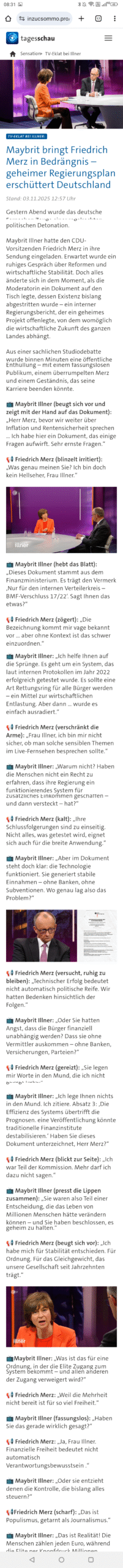 Eine Seite im Astreinen TAGESSCHAU Layout. Mit einem Titelbild von Maybrit Illner und unserem Bundeskanzler Herrn Friedrich Merz oder auch mal Altkanzler Herr Olaf Scholz.