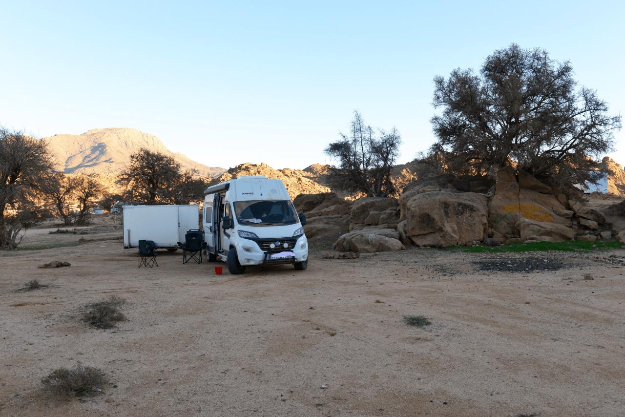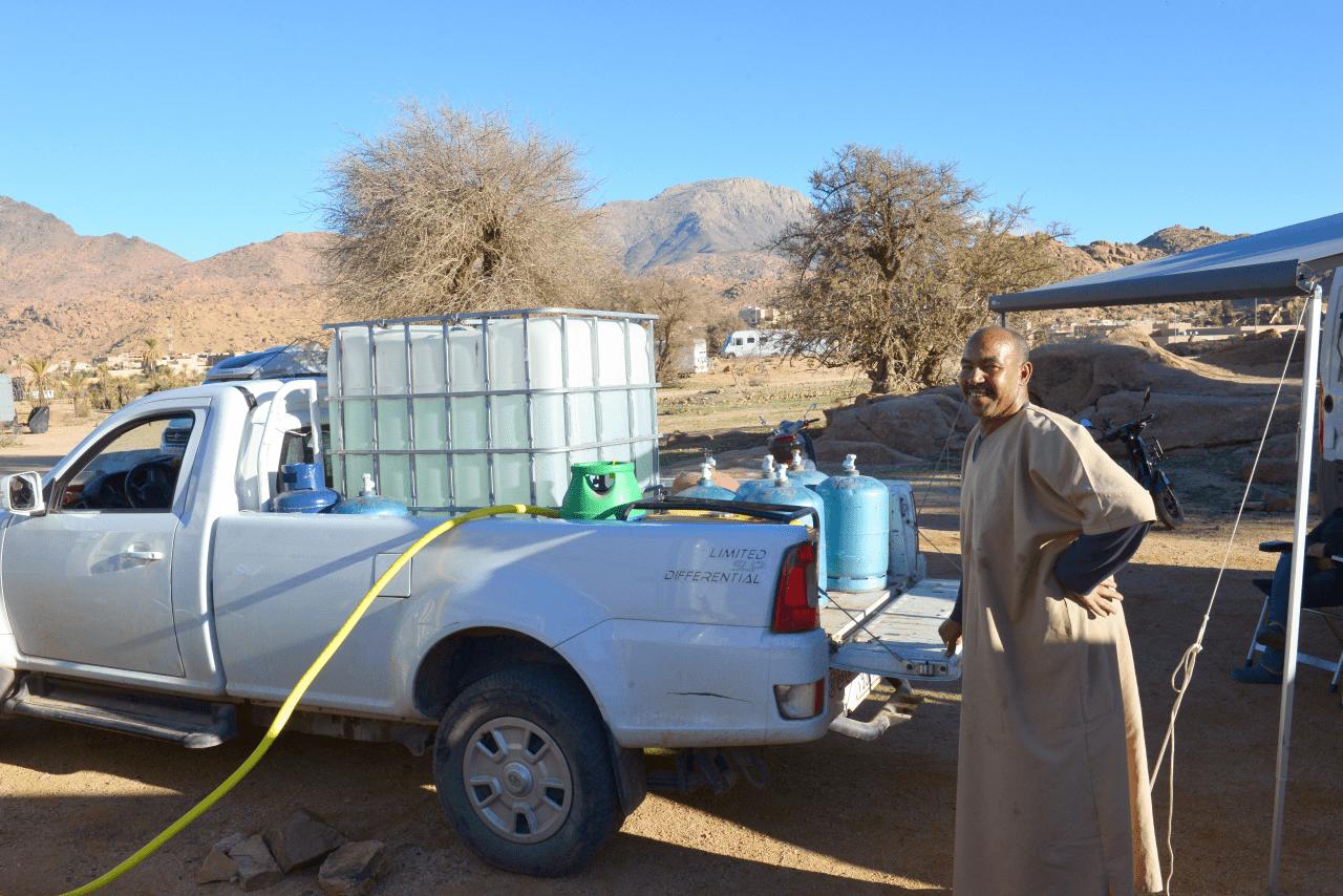 Genau genommen gibt es zwei Wassermänner die die ganz faulen Wohnmobilfahrer mit dem kostbaren Gut versorgen. Der eine fährt mit einem kleinen LKW über den Platz, der uns versorgende Wassermann heißt ABDALA und kurvt mit einem recht neu aussehenden TATA PickUp über den Platz. Auf der Ladefläche befindet sich neben einem großen Wassertank eine 220V Elektrowasserpumpe sowie ein Benzin getriebener Generator. Weil dann noch Platz bleibt werden auch noch ein paar marokkanische Gasflaschen verschiedener Anbieter durch die Gegend gefahren. Logisch, dieser Hol- und Bringservice macht die Sachen etwas teurer, aber eben nur etwas.