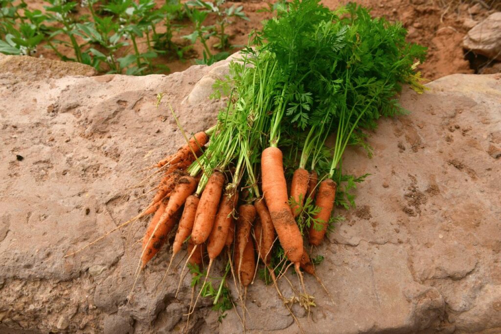 Bei dem ausführlichen Rundgang durch das Dorf und dessen Umgebung machen wir auch halt im Garten von MOHAMMEDs Familie. Er erntet für uns Möhren, Erbsen, Rettich und Koreander. All das wächst in einem recht sandig daher kommenden Boden, eigentlich unglaublich.