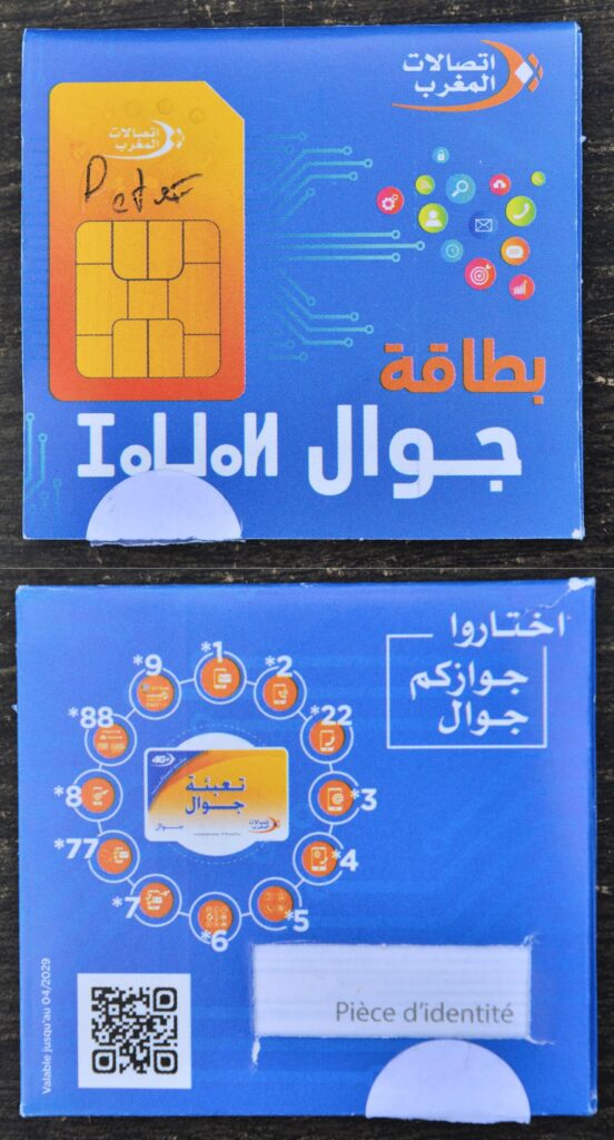 Geht in jedem INWI Shop, aber nicht im Kiosk. Für den Kauf wird ein Ausweis benötigt, die SIM Karte wird dann direkt frei geschaltet, hat aber noch kein Guthaben. Das kauft man per Rubbelkarten in irgendeinem Kiosk, am Besten man nimmt immer direkt die 50iger DH Karten. INWI bietet einen ALL-YOU-CAN-EAT Tarif für Touristen an, 500 DH für unbegrenzt alles für 30 Tage. Das hat auch gut funktioniert, bis auf die Internationalen Anrufe. Eine täglich in Köln angerufene Festnetznummer war nach gut 20 Tagen nicht mehr erreichbar. Ferner scheint INWI ein „kreatives“ Telefonrouting zu verwenden. Die angerufenen Festnetznummern in Deutschland hatten nie eine Marokkonummer, sondern immer (scheinbar wahllos) ein osteuropäisches Land. Hat aber funktioniert.